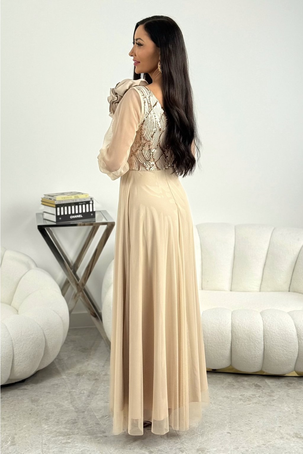 Elegantné dlhé spoločenské šaty v zlatej farbe zaujmú na prvý pohľad svojím trblietavým vrchom zdobeným flitrami a originálnou 3D kvetinou na ramene. Priehľadné dlhé rukávy z jemného tylu dodávajú modelu romantický nádych, zatiaľ čo hlboký rázpor na sukni krásne predĺži nohy. Tento model je ideálny na ples, svadbu, večierok alebo stužkovú, no vynikne aj ako výrazný outfit na slávnostnú oslavu.