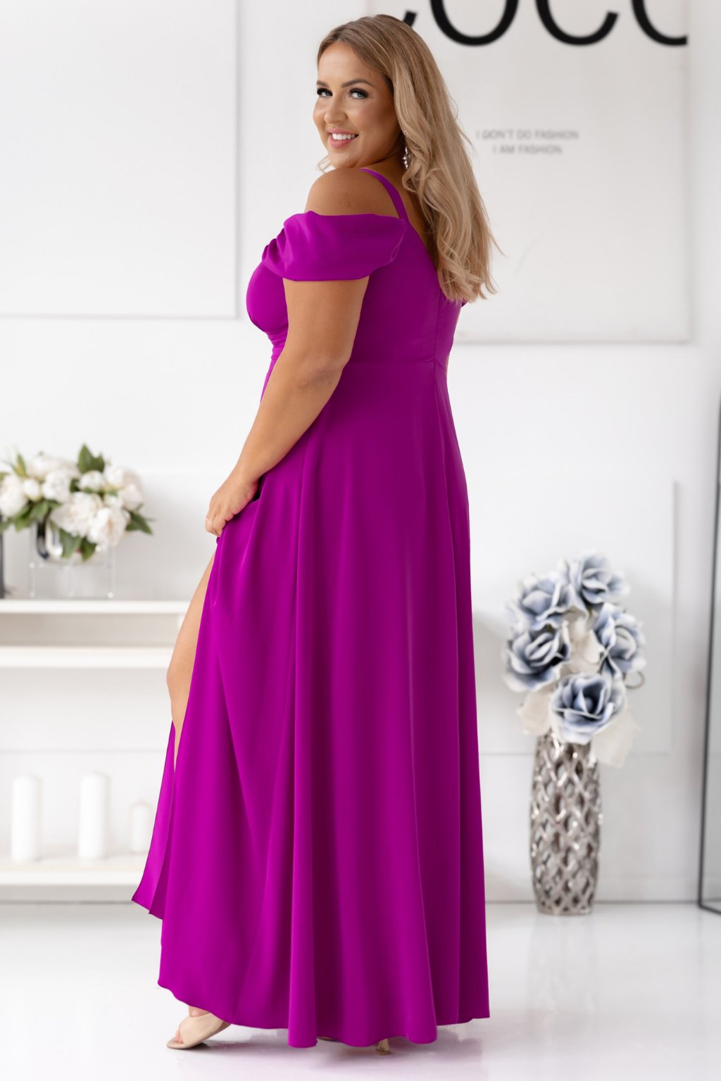 Tieto dlhé fuchsiové plus size spoločenské šaty pre moletky sú dokonalou kombináciou elegancie a romantiky. Zavinovací vrch s jemným riasením krásne tvaruje dekolt, zatiaľ čo odhalené ramená s padavými rukávmi dodávajú šatám ženský a sofistikovaný vzhľad. Splývavá sukňa s jemným rozparkom zabezpečuje pohodlie a ladný pohyb. Ideálne na svadbu, ples, stužkovú či elegantný večierok, kde budete vyzerať neodolateľne a sebavedomo.
