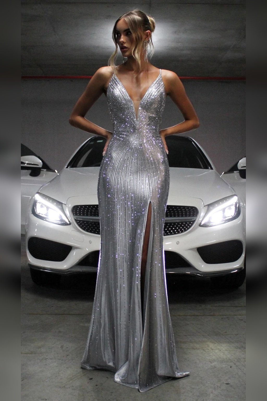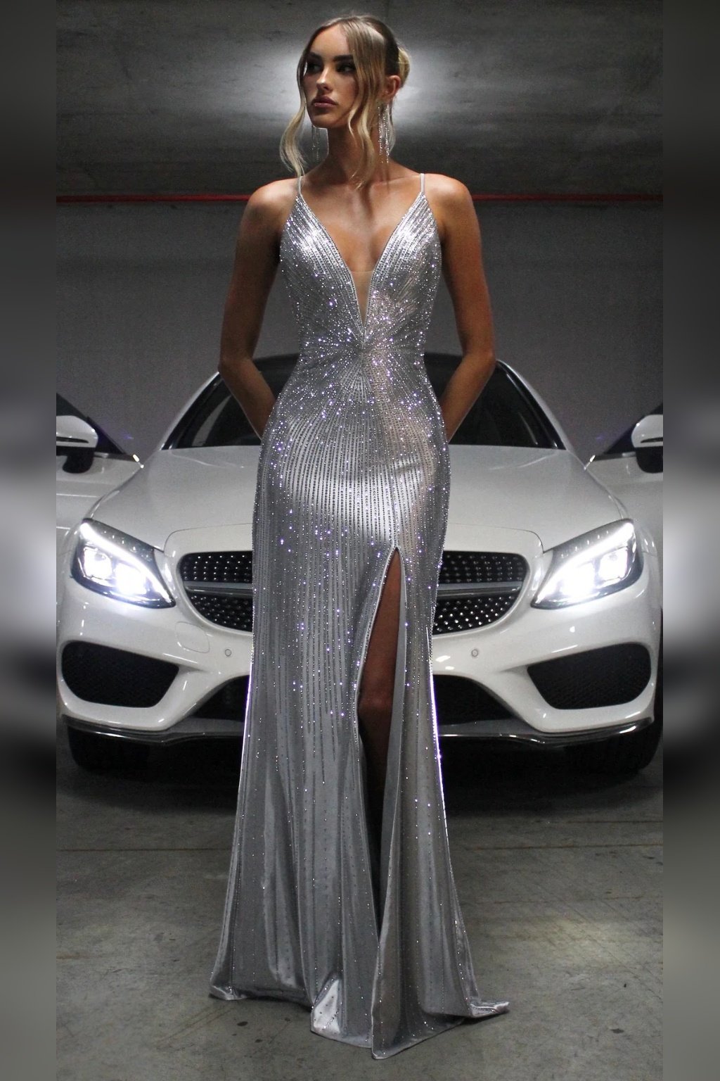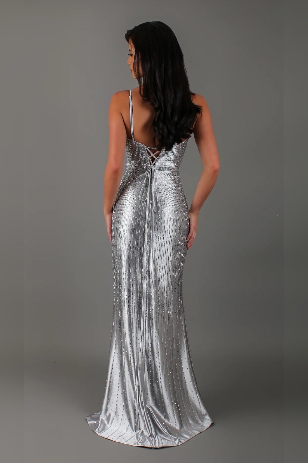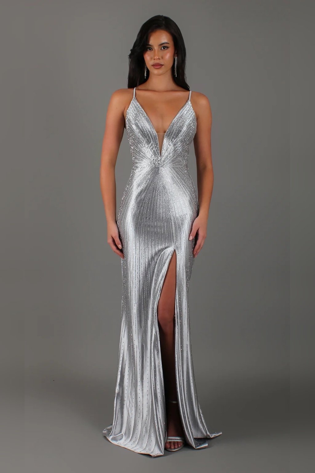 Dlhé spoločenské šaty v nádhernom odtieni striebornej s výrazným leskom a trblietavými detailmi s hlbokým výstrihom v tvare V a jemné ramienka pôsobia žensky a elegantne. Rozparok na nohe dodáva modelu šmrnc. Zadné viazanie umožňuje prispôsobiť si šaty postave. Vhodné na ples, stužkovú, galavečer. Sú mierne elastické a na hrudníku majú výstuž.