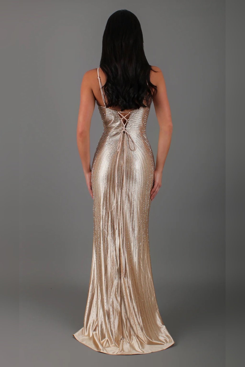 Dlhé spoločenské šaty v nádhernom odtieni zlatej s výrazným leskom a trblietavými detailmi s hlbokým výstrihom v tvare V a jemné ramienka pôsobia žensky a elegantne. Rozparok na nohe dodáva modelu šmrnc. Zadné viazanie umožňuje prispôsobiť si šaty postave. Vhodné na ples, stužkovú, galavečer. Sú mierne elastické a na hrudníku majú výstuž.