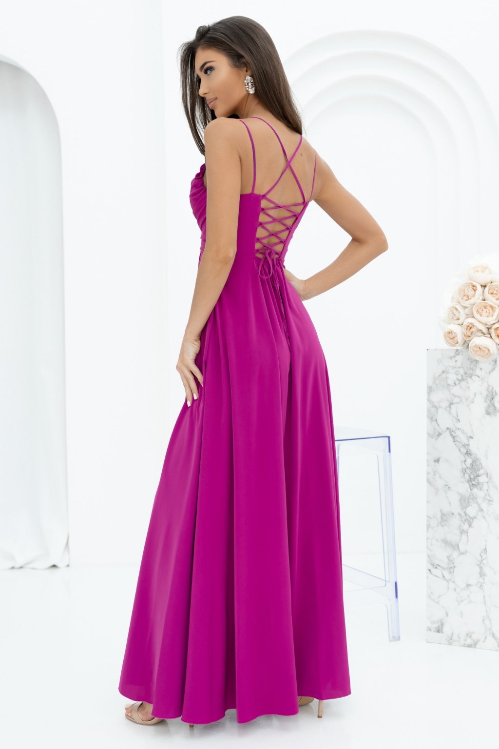 Elegantné dlhé spoločenské šaty v žiarivej fuchsiovej farbe s rafinovaným splývavým vrchom a jemnými špagetovými ramienkami očaria na každom plese, svadbe či stužkovej. Zvýraznený rozparok na sukni, zvodné viazanie na chrbte a praktická gumička v páse zabezpečia dokonalé prispôsobenie postave a maximálne pohodlie. Tento luxusný model šiat je ideálny na svadby, večierky, plesy alebo ako šaty pre družičky, keď chcete zažiariť a cítiť sa neodolateľne.