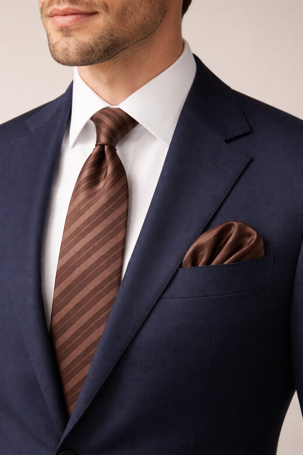 Hnedá hand made pruhovaná kravata s vreckovkou