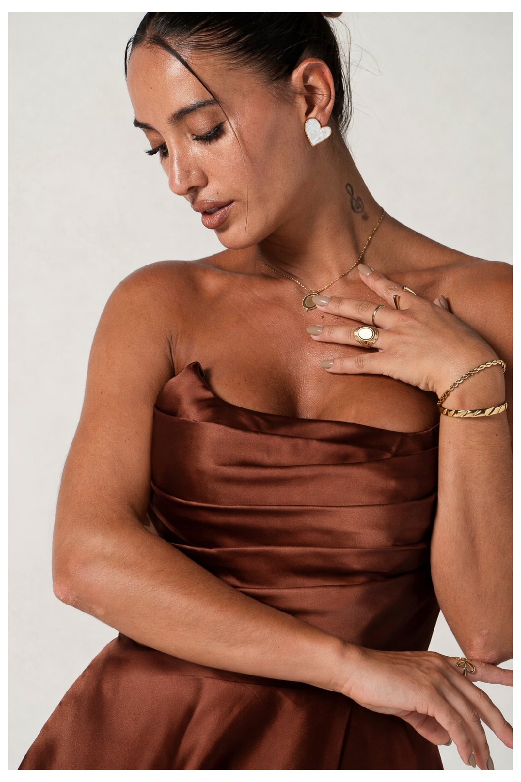 Táto dlhá hnedá spoločenská róba je stelesnením jemnej elegancie a ženskosti. Hladký saténový materiál, nariasený vrch, výrazný rozparok na sukni a praktické vrecká z nej robia kombináciu štýlu a komfortu. Súčasťou sú aj pripínateľné ramienka, ktoré zabezpečia väčšiu istotu a flexibilitu pri nosení – ideálna voľba na ples, stužkovú, ako popolnočné šaty či na svadbu ako hosť.