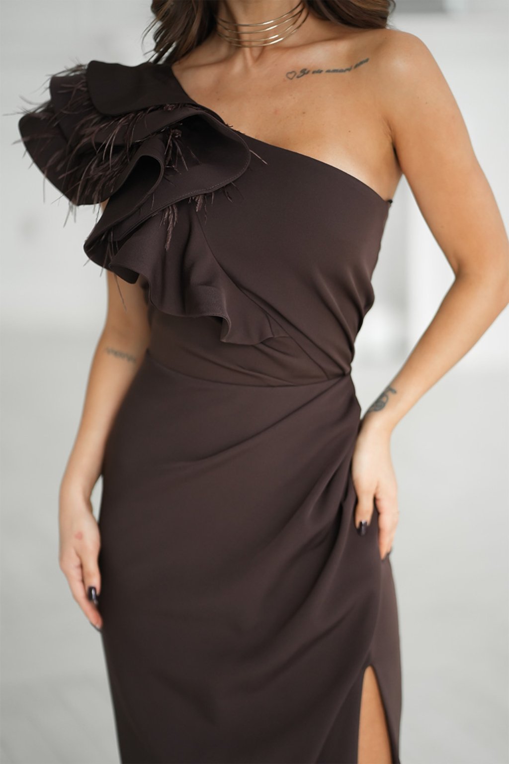 Dlhé hnedé spoločenské šaty na jedno rameno sú stelesnením ženskosti a noblesy. Výrazný volán s pierkami na ramene dodáva modelu exkluzívny charakter, zatiaľ čo hlboký rozparok na sukni pôsobí zvodne a opticky predlžuje postavu. Tieto šaty sú ideálne na ples, galavečer, svadbu či inú výnimočnú spoločenskú udalosť, kde chcete vyniknúť a zanechať nezabudnuteľný dojem.