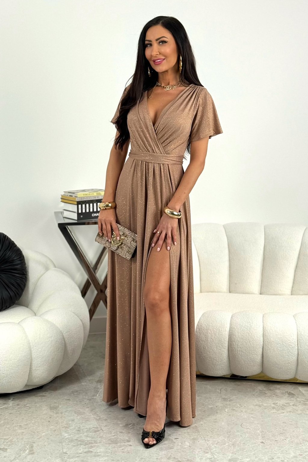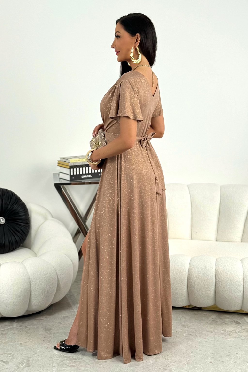 Elegantné dlhé hnedé spoločenské šaty z trblietavej látky pôsobia luxusne. Výstrih do V, motýlie rukávy a dizajn s opaskom a gumičkou v páse krásne tvarujú postavu a dodávajú pohodlie, zatiaľ čo rozparok zvýrazní ženskosť. Ideálne na stužkovú, ples, svadbu, oslavu či večierok.
