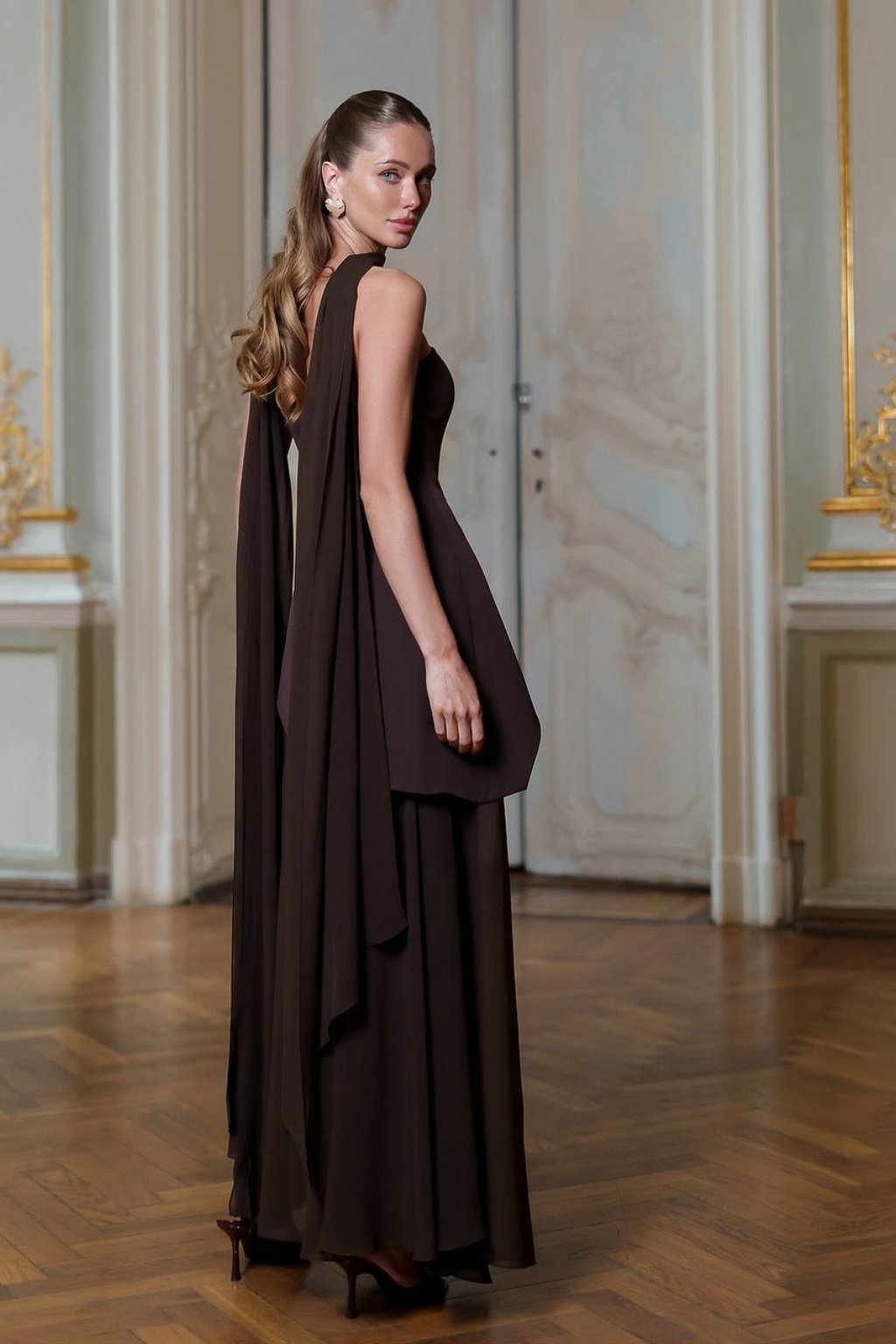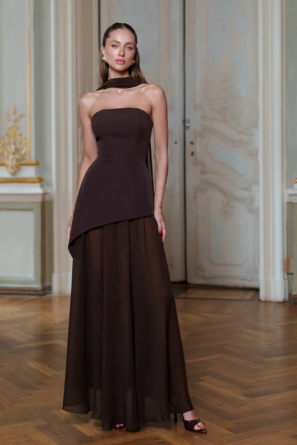 Luxusný trojdielny dámsky komplet v elegantnej čokoládovohnedej farbe pozostáva z korzetového topu s asymetrickým strihom, dlhej šifónovej sukne na gumičku a šálu. Prémiový krepový top nádherne formuje postavu, zatiaľ čo vzdušná, polopriesvitná sukňa s jemným leskom dodáva modelu eleganciu. Tento komplet je ideálnou voľbou na ples, stužkovú, svadbu, spoločenský večierok, alebo oslavu.