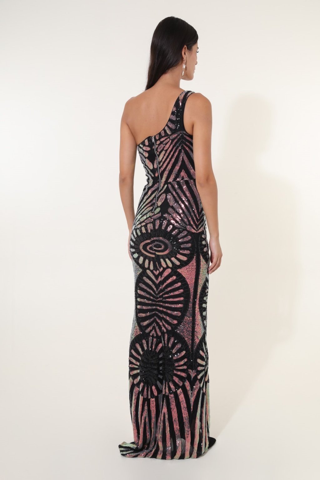 Unikátne jednoramenné spoločenské šaty s výrazným geometrickým vzorom a flitrovaným dizajnom, ktoré zaručene pritiahnu pozornosť. Tesný strih zvýrazňuje ženskú siluetu a dlhý splývavý strih dodáva šatám eleganciu. Ideálne na galavečery, formálne plesy alebo extravagantné večerné podujatia.