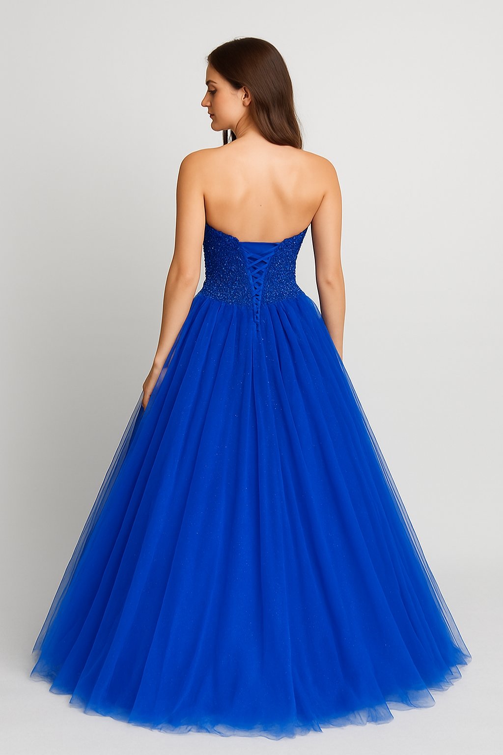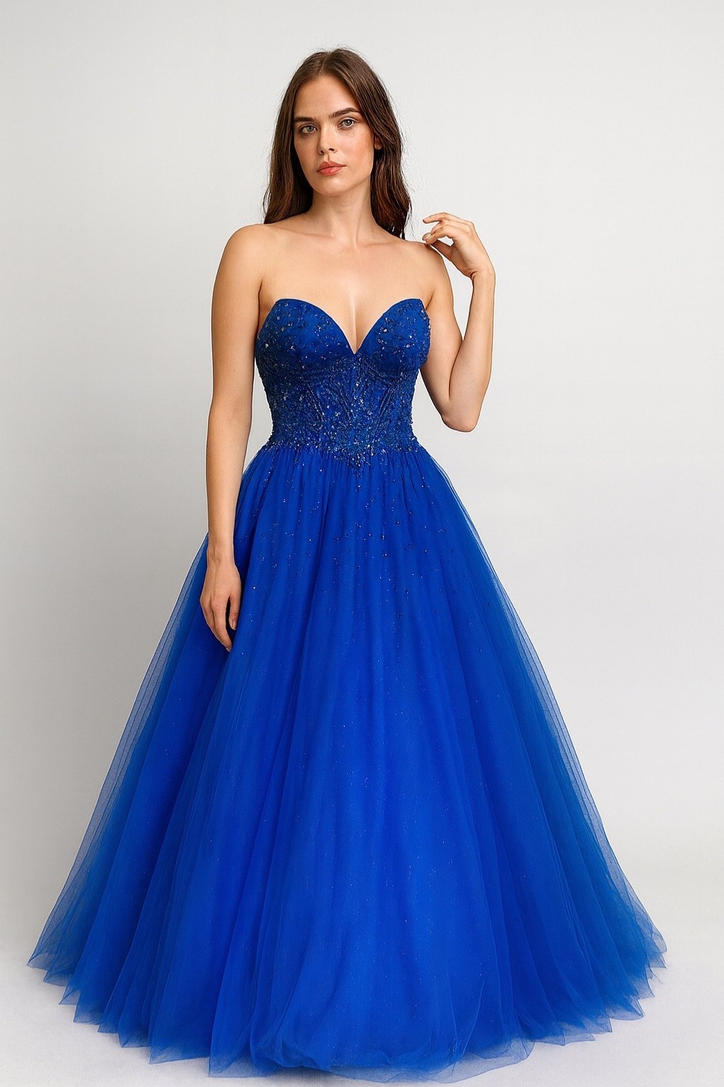 Kráľovsky modré plesové šaty s dlhou tylovou sukňou a zdobeným korzetovým vrchom sú dokonalou voľbou pre každú slávnostnú príležitosť. Srdiečkový výstrih bez ramienok krásne zvýrazní dekolt, zatiaľ čo šnurovanie na chrbte zabezpečí ideálne prispôsobenie postave. Tieto elegantné šaty sú ideálne na ples, stužkovú, svadbu, ako popolnočné šaty pre nevestu, aj večerný galavečer.