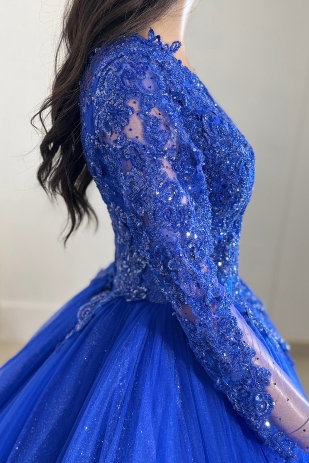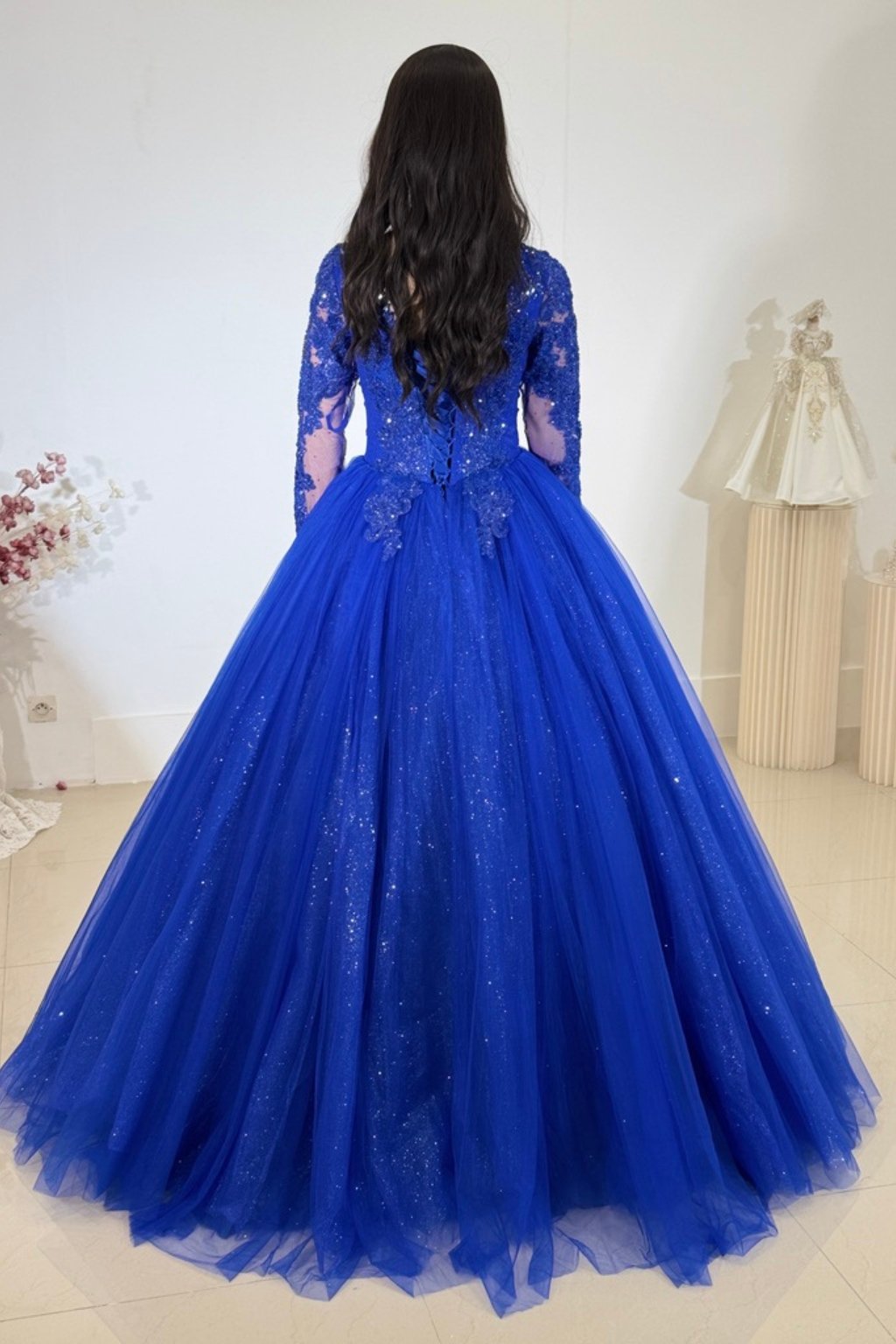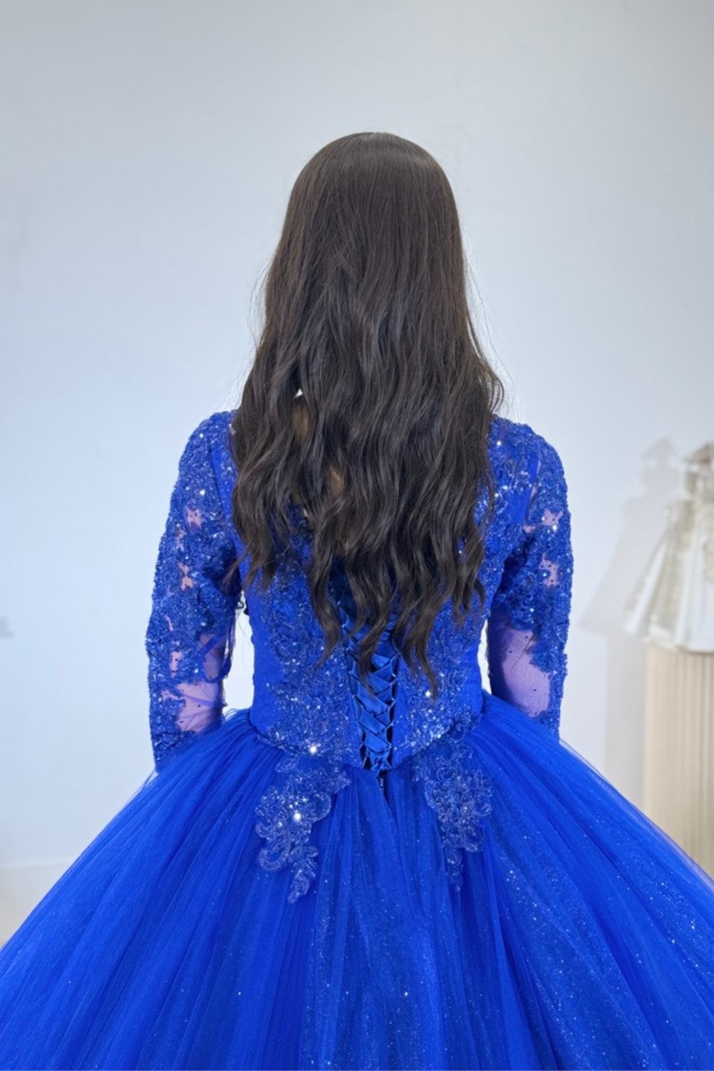 Zahaľte sa do luxusu s týmito dlhými spoločenskými šatami s rukávmi, ktoré vynikajú intenzívnou kráľovsky modrou farbou, bohatou trblietavou tylovou sukňou a detailne vyšívaným čipkovaným vrchom. Elegantný výstrih do V, dlhé priehľadné rukávy a šnurovanie na chrbte zaručia perfektné prispôsobenie postave. Ideálne na ples, stužkovú, svadbu či galavečer.