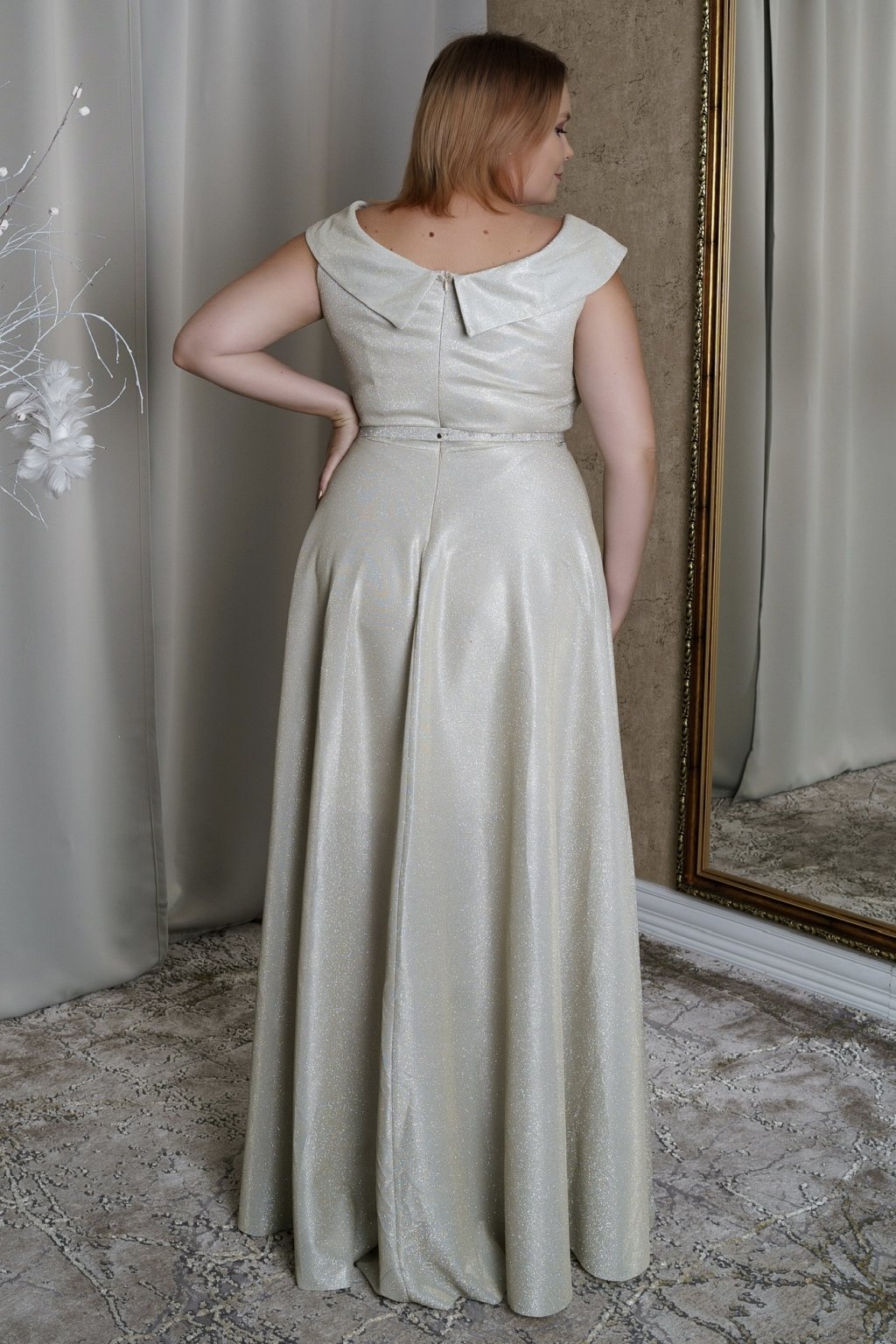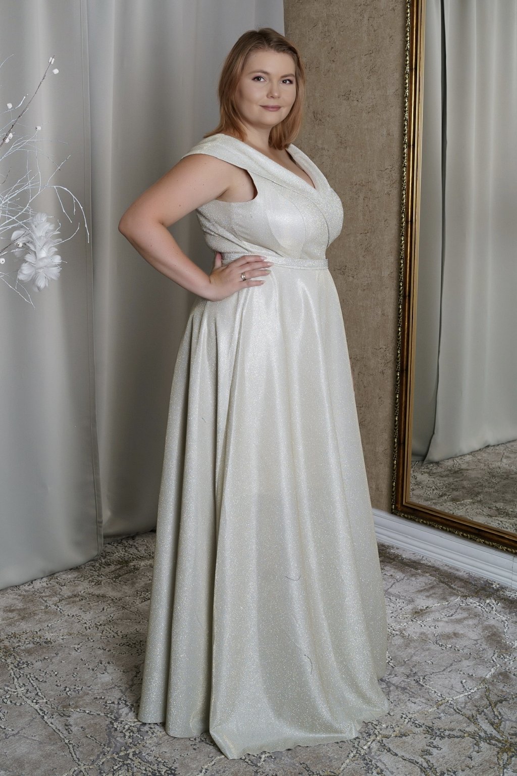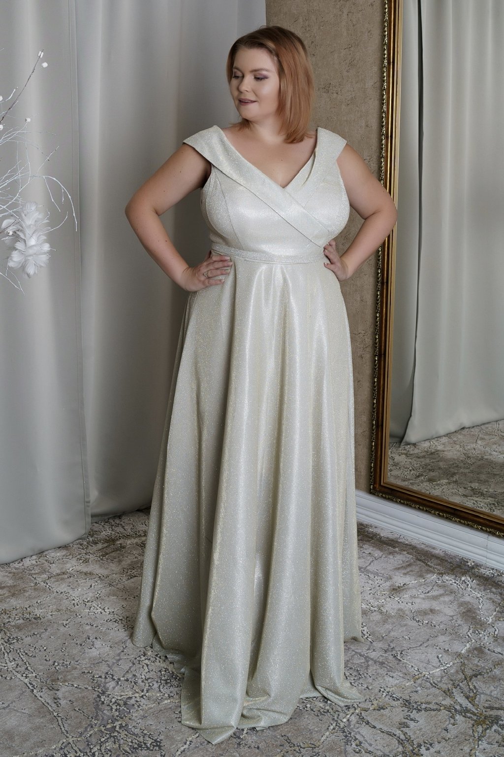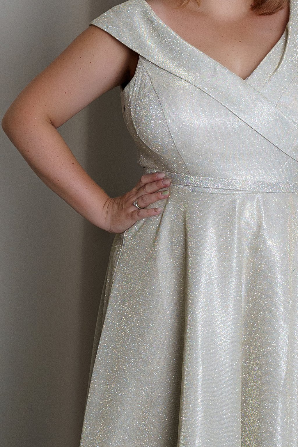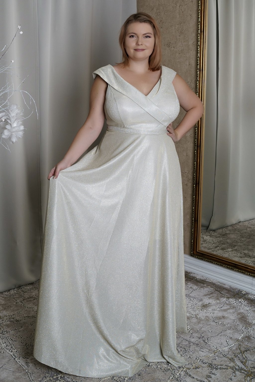 Tieto šaty majú jemný perleťový lesk, ktorý z nich robí dokonalý výber na špeciálne príležitosti, ako sú svadby, plesy či oslavy. Elegantný dlhý strih s jemným rozšírením lichotí každej postave, zatiaľ čo prekrížený výstrih a jemné riasenie zvýrazňujú ženskosť. Ich jednoduchá, no sofistikovaná elegancia je ideálna pre modernú ženu, ktorá hľadá nadčasový štýl.