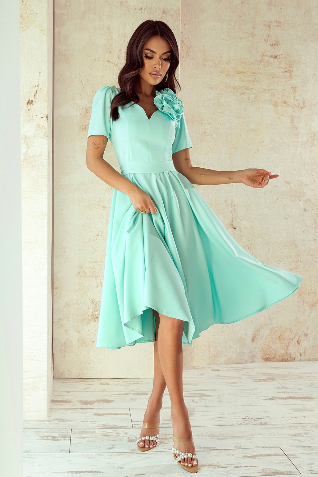 Elegantné mätové midi šaty s krátkymi rukávmi a výstrihom do V pôsobia romanticky a nadčasovo. Ich špeciálnym detailom je odnímateľná 3D kvetinová aplikácia na ramene a mašľa na chrbte, ktoré dodávajú šatám ženský pôvab. Vďaka pohodlnému strihu sú ideálne na svadbu, rodinnú oslavu, krstiny, spoločenský večierok či letnú slávnosť.