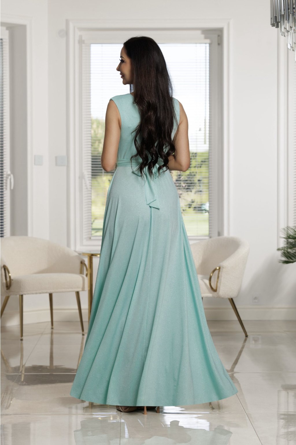 Tieto dlhé spoločenské šaty v mentolovej farbe s jemným trblietavým efektom sú ideálnou voľbou pre ženy, ktoré chcú zažiariť na každej výnimočnej udalosti. Model má maxi dĺžku, áčkový strih a elegantný zavinovací vrch s hlbokým V-výstrihom, ktorý krásne zvýrazní dekolt a opticky zoštíhli postavu.