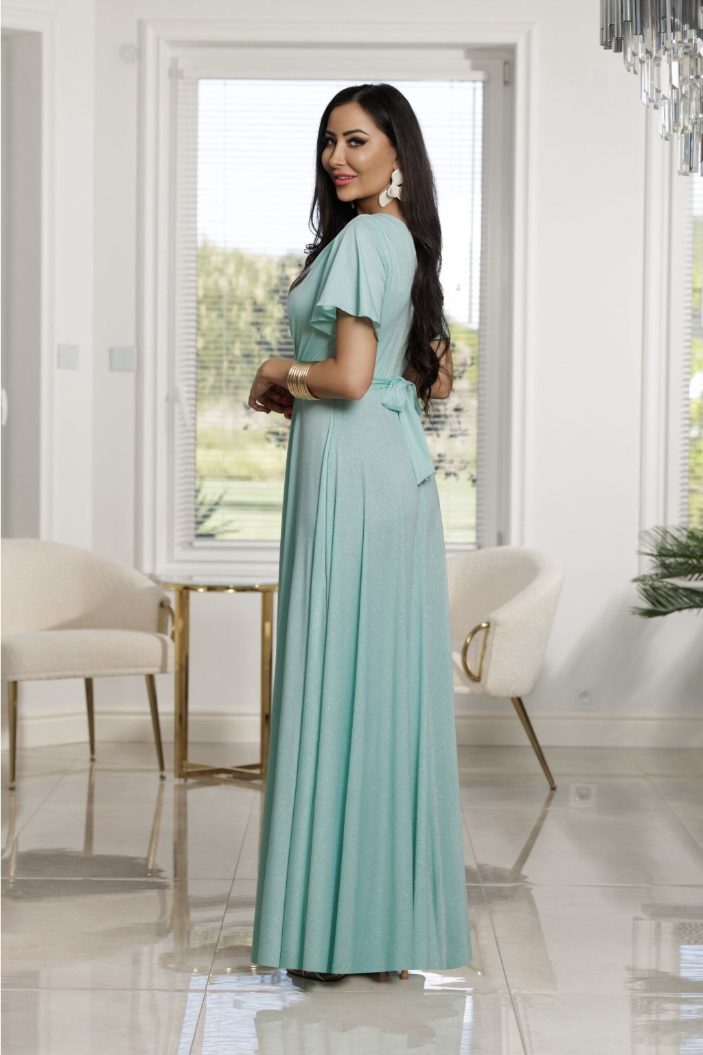 Elegantné dlhé mentolové spoločenské šaty z trblietavej látky pôsobia luxusne. Výstrih do V, motýlie rukávy a dizajn s opaskom a gumičkou v páse krásne tvarujú postavu a dodávajú pohodlie, zatiaľ čo rozparok zvýrazní ženskosť. Ideálne na stužkovú, ples, svadbu, oslavu či večierok.