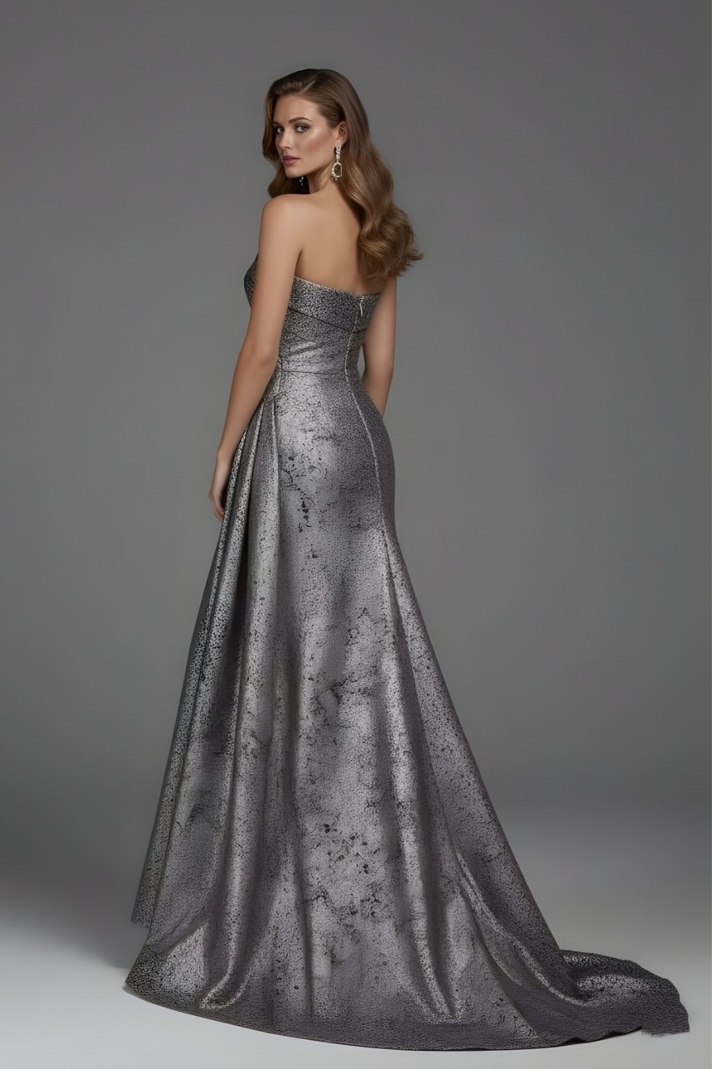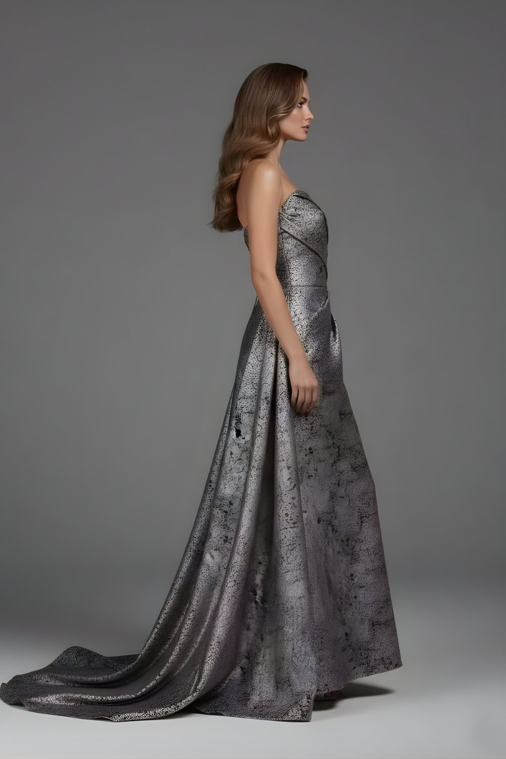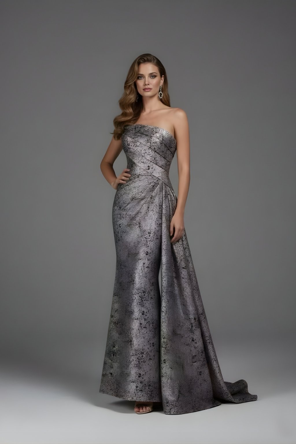 Tieto dlhé spoločenské šaty s odnímateľnými ramienkami v originálnom metalickom odtieni s mramorovým vzorom sú ideálnou voľbou pre ženy, ktoré chcú zaujať. Korzetový vrch krásne tvaruje postavu, zatiaľ čo rozšírená sukňa s jemným prekladaním dodáva šatám noblesný a luxusný charakter. Skvelé na ples, večernú udalosť, svadbu či silvestrovskú oslavu.