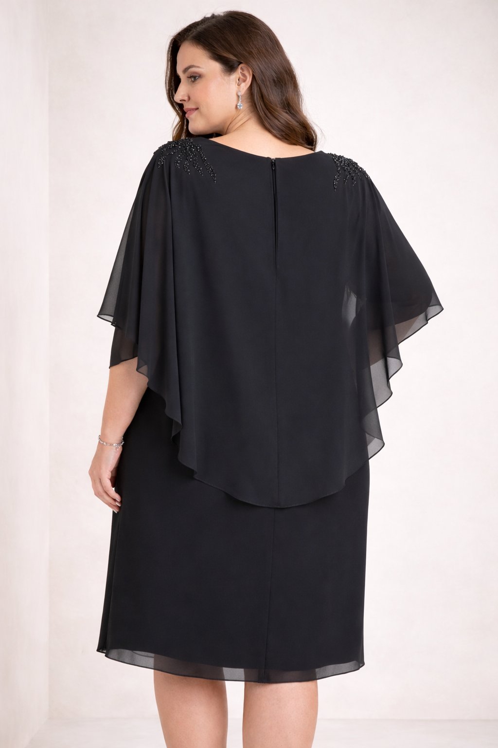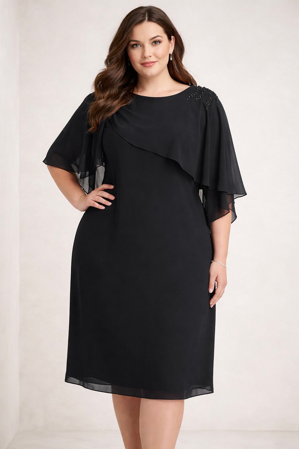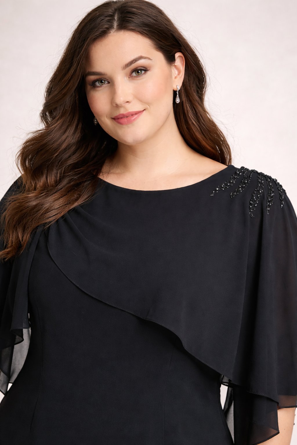 Elegantné čierne spoločenské šaty midi sú ideálnou voľbou pre ženy, ktoré preferujú nadčasový štýl a pohodlie. Šaty majú voľnejší rovný strih, ktorý lichotí každej postave a poskytuje maximálny komfort počas nosenia. Dominantným prvkom je šifónový prekladaný vrch s asymetrickým volánom, ktorý jemne prekrýva hornú časť tela a pôsobí veľmi elegantne. Dlhé splývavé rukávy zo šifónu dodávajú šatám ľahkosť a ženskosť. Ramenná časť je zdobená jemnými korálikovými aplikáciami, ktoré vytvárajú luxusný detail. Zapínanie na zips na chrbte. Ideálne na svadbu, ples, oslavu, večierok či spoločenské udalosti.