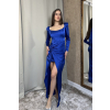 Tieto luxusné modré šaty zaujmú predĺženým asymetrickým strihom a dramatickým rozparkom, ktorý opticky predlžuje nohy a dodáva sofistikovaný vzhľad. Dlhé rukávy a elegantne tvarovaný korzet s jemnými detailmi zvýrazňujú ženské krivky, zatiaľ čo saténový materiál pôsobí noblesne. Perfektná voľba na plesy, galavečery alebo večerné spoločenské akcie, kde budete neprehliadnuteľná.