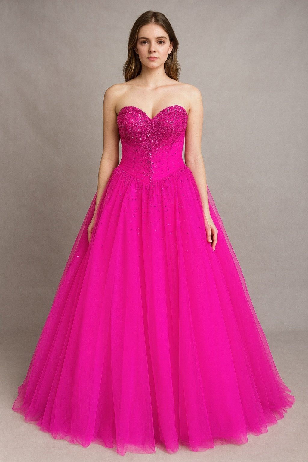 Zvýraznite svoju ženskosť s týmito fuchsiovými princeznovskými šatami, ktoré okamžite upútajú každým detailom. Korzetový vrch bez ramienok je bohato zdobený flitrami a kamienkami, ktoré dodávajú šatám oslnivý lesk, zatiaľ čo objemná tylová sukňa vytvára nádherný siluetový efekt. Tieto dlhé ružové spoločenské šaty sú ako stvorené na stužkovú, ples, svadbu alebo každú udalosť, kde chcete zažiariť ako hviezda večera.