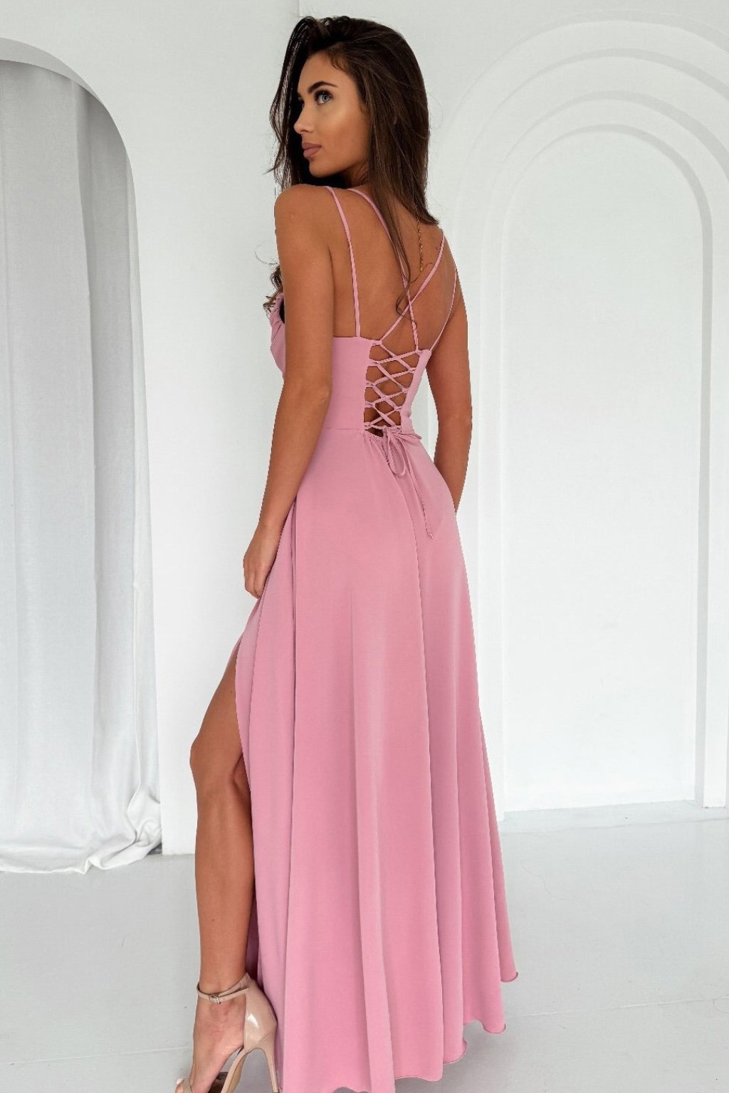 Elegantné dlhé spoločenské šaty v staroružovej farbe s rafinovaným splývavým vrchom a jemnými špagetovými ramienkami očaria na každom plese, svadbe či stužkovej. Zvýraznený rozparok na sukni, zvodné viazanie na chrbte a praktická gumička v páse zabezpečia dokonalé prispôsobenie postave a maximálne pohodlie. Tento luxusný model šiat je ideálny na svadby, večierky, plesy alebo ako šaty pre družičky, keď chcete zažiariť a cítiť sa neodolateľne.