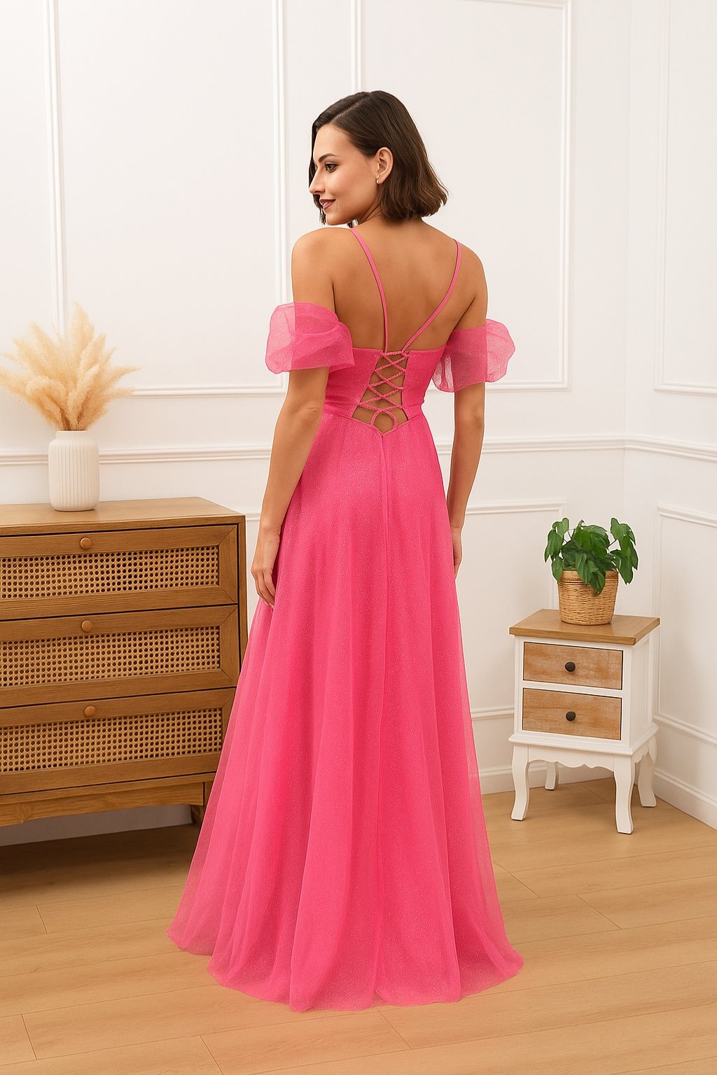 Dlhé ružové tylové spoločenské šaty s A-línovou sukňou a vysokým rázporkom okamžite pritiahnu pozornosť, pričom jemná trblietavá vrstva dodá vášmu každému kroku éterický lesk. Vrch s hlbokým V výstrihom na tenkých ramienkach a odnímateľnými balónovými rukávmi zmyselne odhaľuje ramená, kým korzetové šnurovanie vzadu krásne formuje pás a umožňuje dokonalé prispôsobenie postave. Ak hľadáte dlhé ružové šaty, tylové šaty s rázporkom, šaty s odhalenými ramenami či šaty na ples, svadbu alebo stužkovú, tento model je skvelou voľbou.