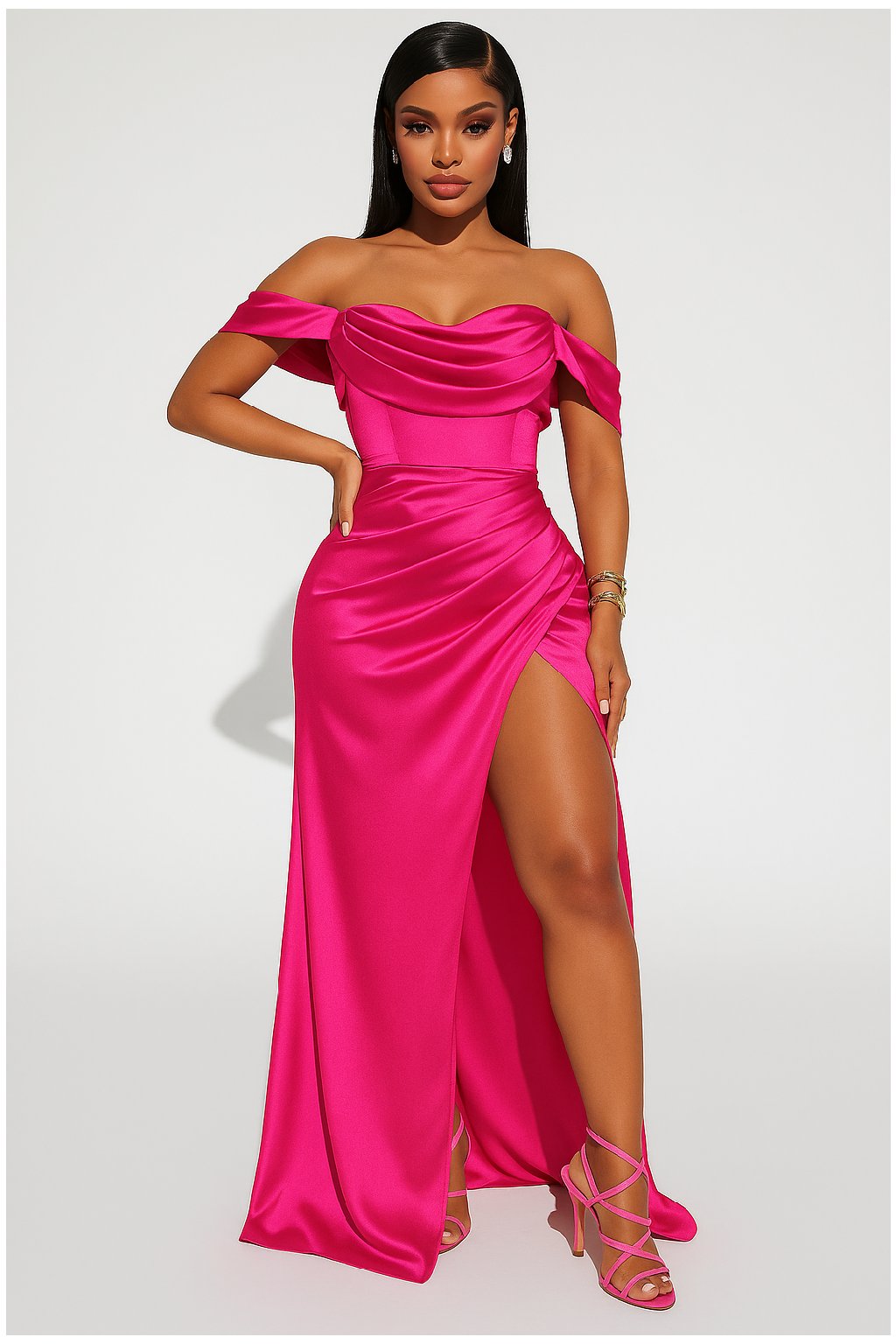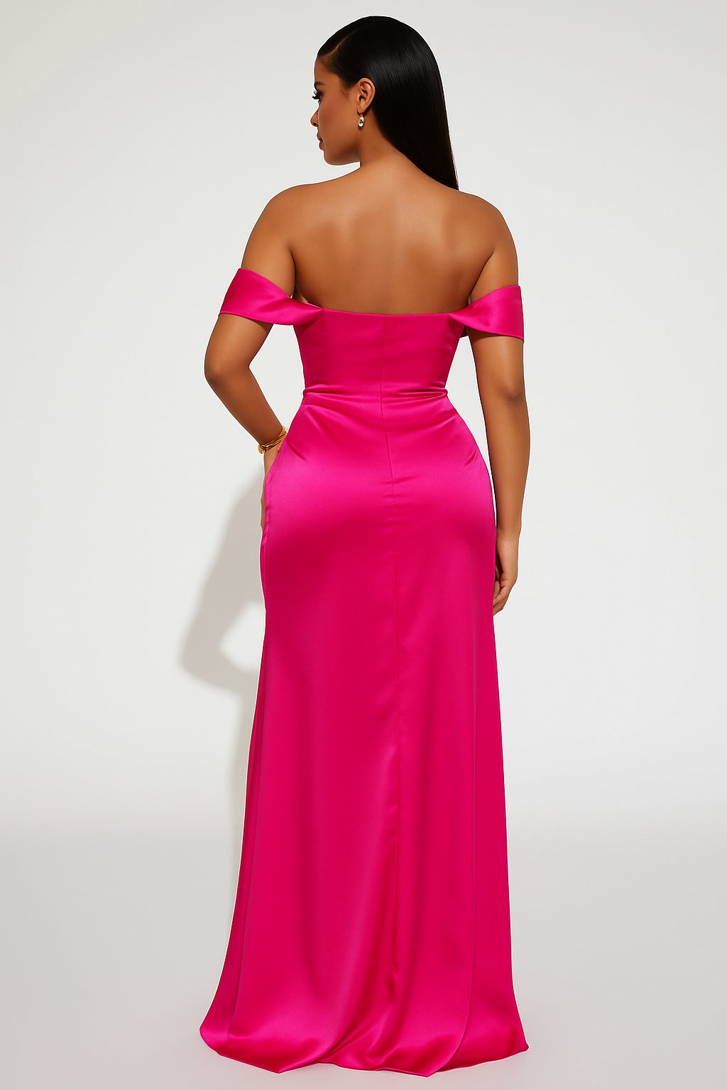 Luxusné dlhé saténové šaty v sýtej fuchsiovej farbe sú perfektnou voľbou na ples, galavečer, svadbu či exkluzívnu oslavu. Elegantný strih s odhalenými ramenami dodáva modelu sofistikovaný vzhľad, zatiaľ čo vysoký rázporok na sukni pridáva na zmyselnosti a umožňuje pohodlný pohyb. Lesklý saténový materiál krásne odráža svetlo a zvýrazňuje luxusný charakter šiat.
