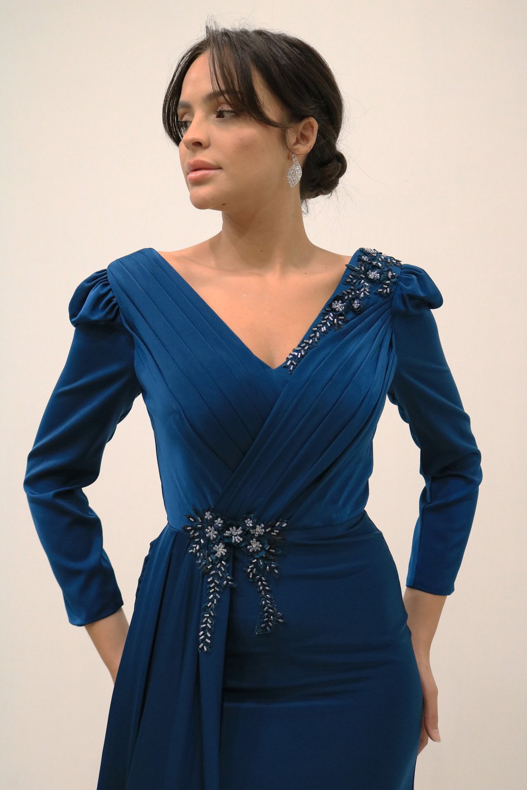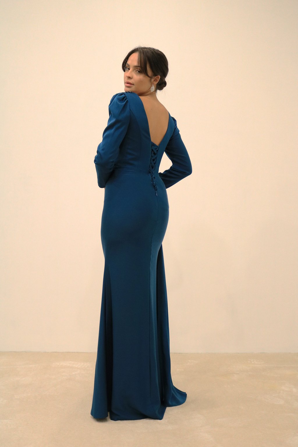 Tieto modré šaty sú ideálnou voľbou na ples, svadbu, gala večer alebo inú výnimočnú udalosť. Elegantný priliehavý strih s dlhými rukávmi dokonale zvýrazní ženské krivky, zatiaľ čo hlboký výstrih do V vpredu aj vzadu dodáva šatám sofistikovanú zvodnosť. Vysoký rázporok na sukni podčiarkuje ženskosť a umožňuje voľnosť pohybu.