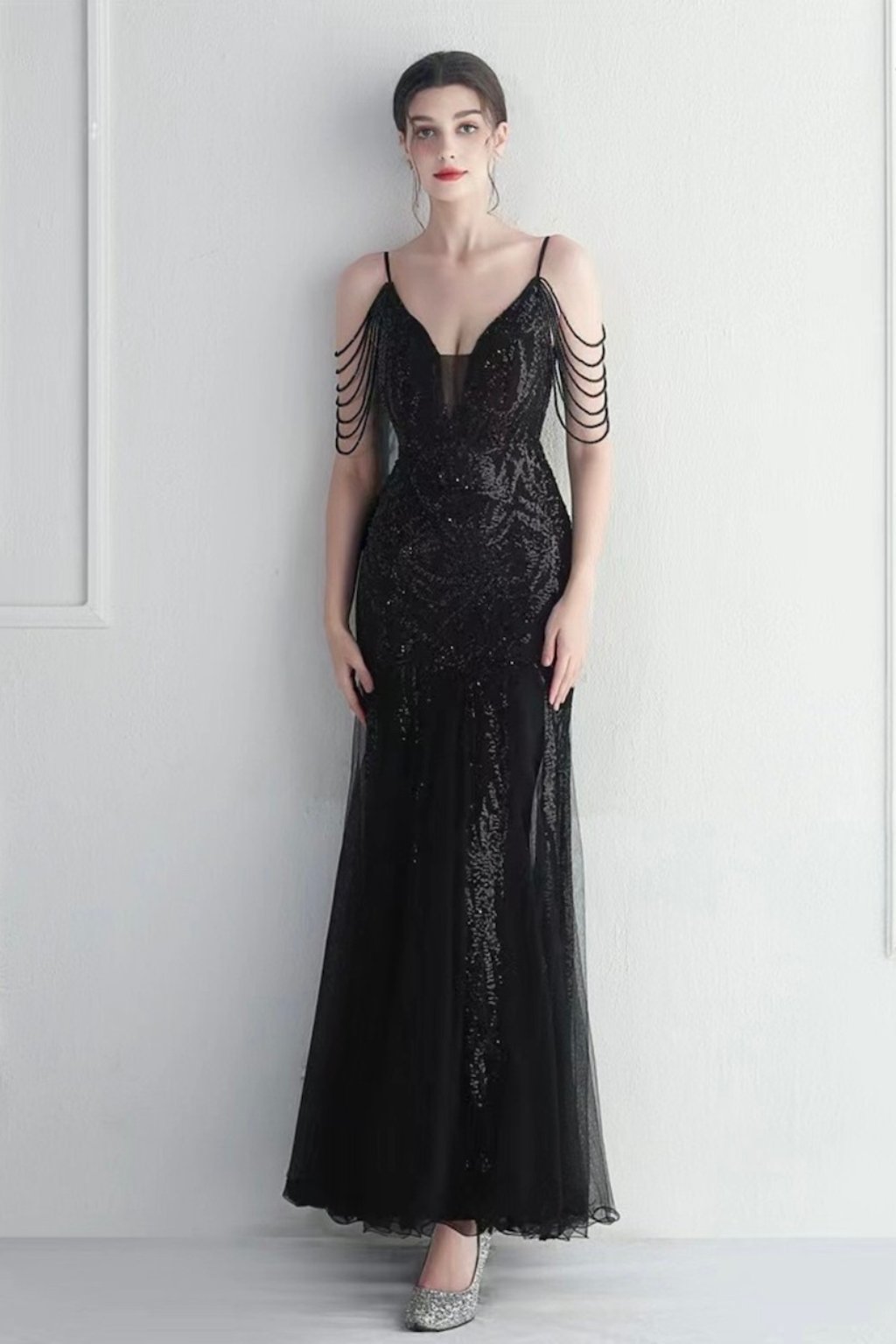 Luxusné čierne spoločenské šaty s flitrovaným zdobením a jemným priesvitným výstrihom, ktoré pridávajú na tajomnosti a elegancii. Unikátne ramenné detaily s reťazovými prvkami dodávajú šatám dramatický nádych. Dlhý splývavý strih je ideálny na galavečery, plesy alebo významné spoločenské udalosti.