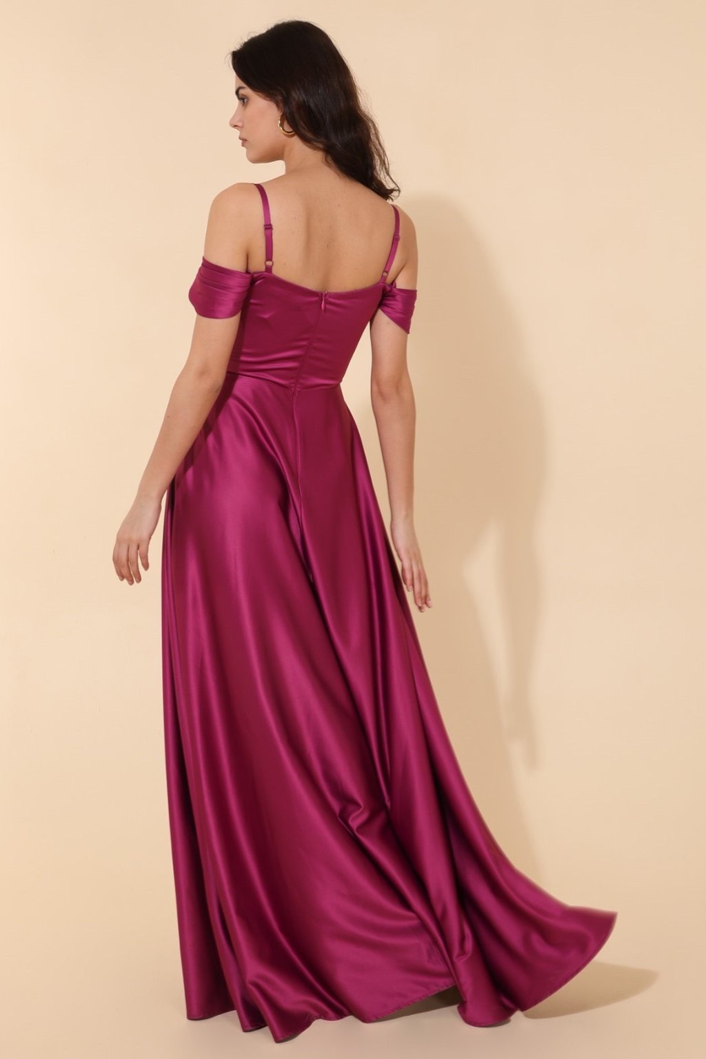 Tieto fialové dlhé šaty sú ideálnou voľbou na ples, svadbu, gala večer či formálnu udalosť. Elegantný off-shoulder strih s jemnými ramienkami dodáva šatám romantický nádych, zatiaľ čo hlboký rázporok na sukni podčiarkuje ženskosť a zvodnosť. Lesklý saténový materiál pôsobí luxusne a krásne splýva pri pohybe, čím vám zaručí očarujúci vzhľad na každej spoločenskej udalosti.