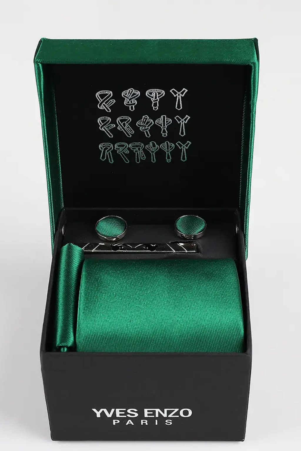 Luxusná pánska sada s kravatou v žiarivej zelenej farbe je dokonalým darčekom aj štýlovým doplnkom pre elegantného muža. Set obsahuje kravatu, vreckovku do saka, manžetové gombíky a sponu na kravatu, všetko dokonale zladené v rovnakom vzore. Ideálna voľba na svadbu, firemný večierok, ples alebo spoločenské podujatie, kde je dôraz na detail a štýl nevyhnutnosťou.