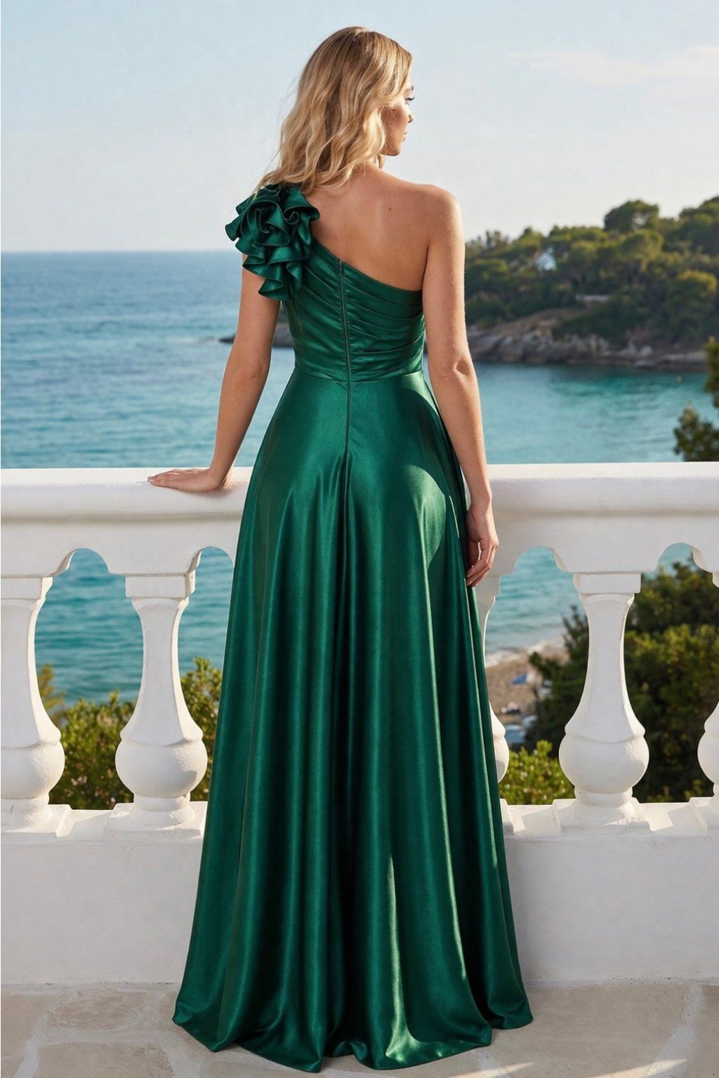 Elegantné dlhé saténové šaty smaragdovej farby s asymetrickým strihom na jedno rameno a výrazným volánovým zdobením na vrchu zaujmú každú ženu, ktorá túži zažiariť. Hladký, jemne lesklý materiál a rozšírený padavý strih sukne lichotia postave. Ideálne na plesy, večierky, stužkové, svadby alebo elegantné oslavy.