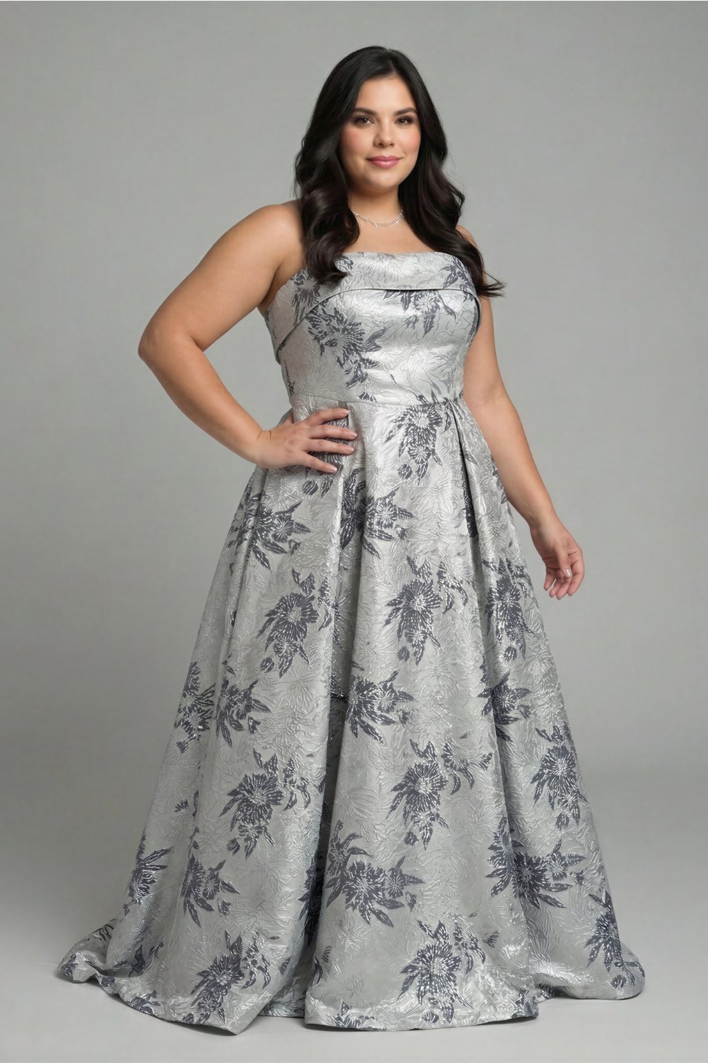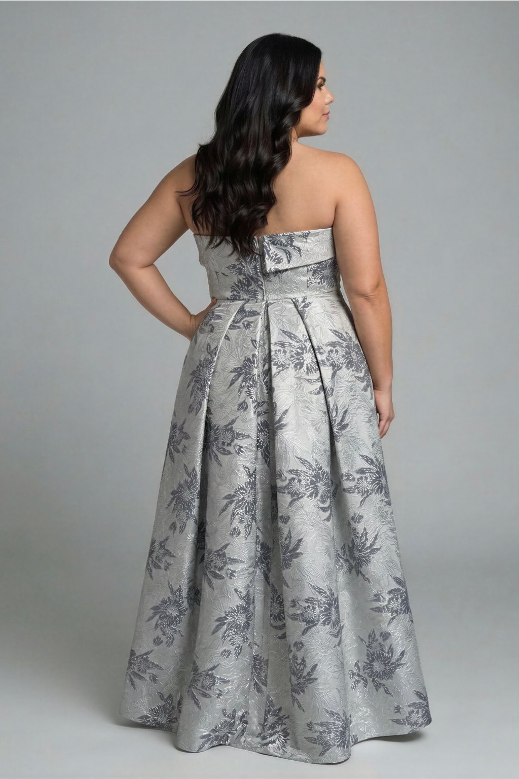 Strieborné brokátové dlhé spoločenské šaty bez ramienok