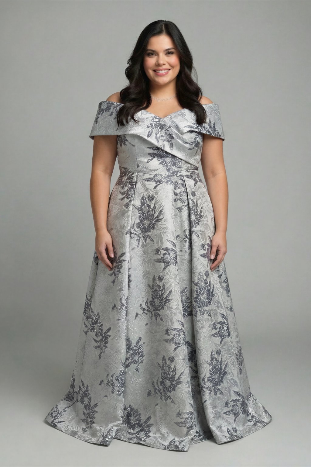 Elegantné strieborné spoločenské šaty s luxusným kvetinovým brokátovým vzorom Vás očaria na prvý pohľad. Šaty majú jemný A-čkový strih s bohatou sukňou a výrazný prekladaný vrch s odhalenými ramenami (off-shoulder), ktorý pôsobí veľmi žensky a sofistikovane. Krátke spustené rukávy opticky zvýraznia dekolt a ramená. V oblasti hrudníka sa nachádzajú vypchávky, ktoré zabezpečia krásny tvar a pohodlné nosenie bez potreby podprsenky. Zapínanie na zips na chrbte. Ideálne na ples, svadbu, stužkovú, oslavu či večierok, ale aj na výnimočné spoločenské udalosti.