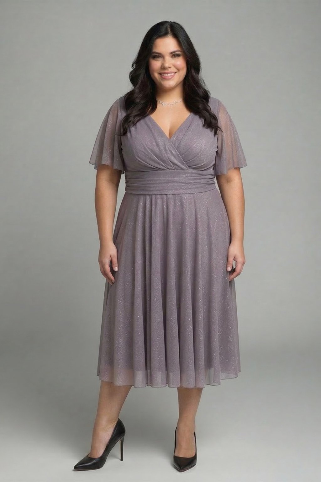 Svetlofialové trblietavé midi spoločenské šaty
