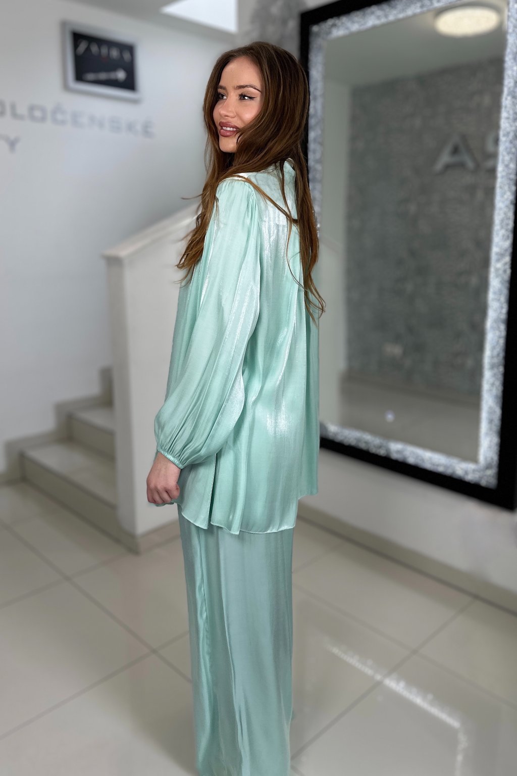 Tento lesklý saténový nohavicový komplet v odtieni svetlozelenej pôsobí žensky a zároveň extravagantne. Voľný top s dlhými rukávmi a viazaním pri krku dodáva outfitu romantický nádych, zatiaľ čo široké nohavice na gumičku zabezpečia maximálne pohodlie. Skvelá voľba na večierok, oslavu, svadbu či spoločenské stretnutie.