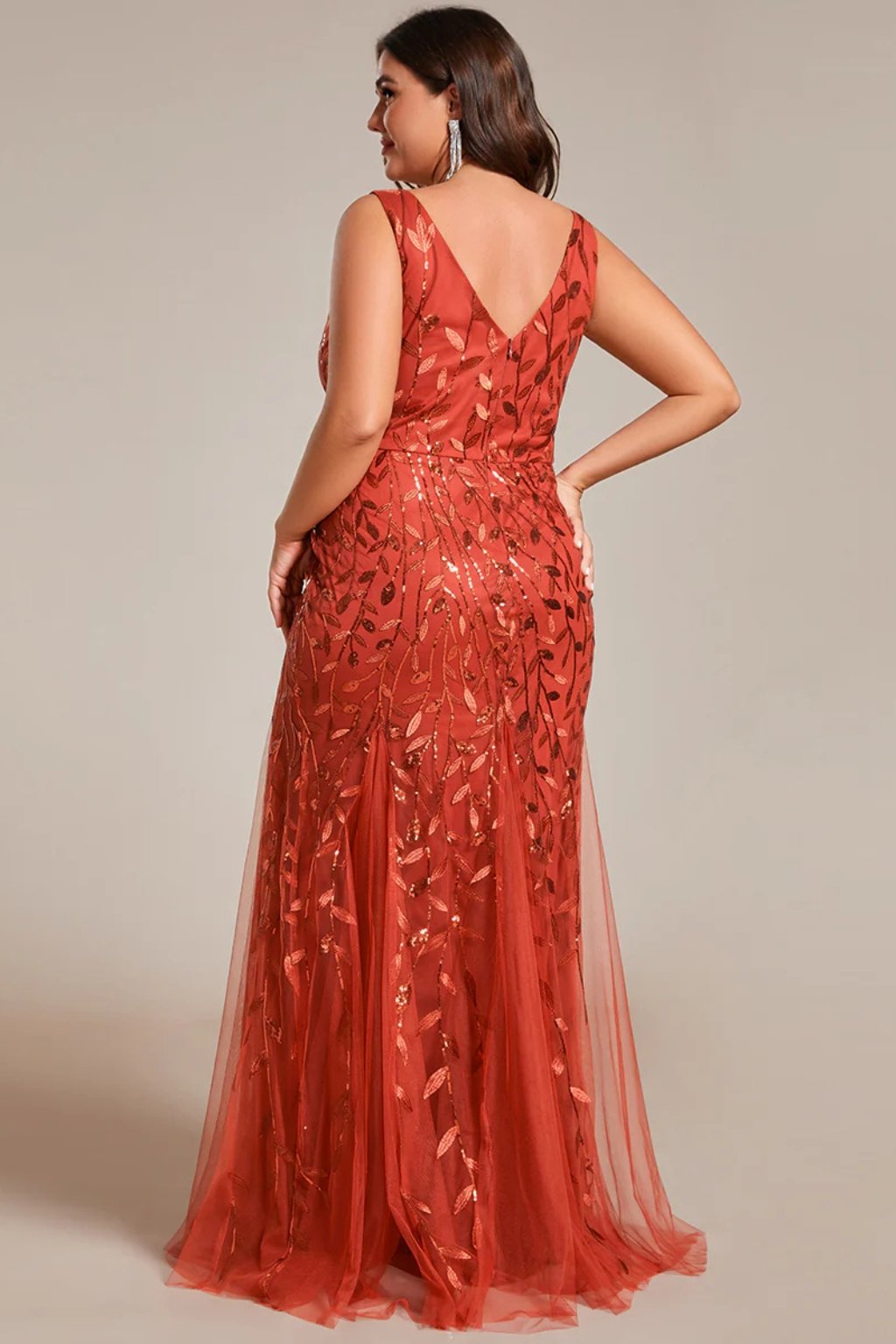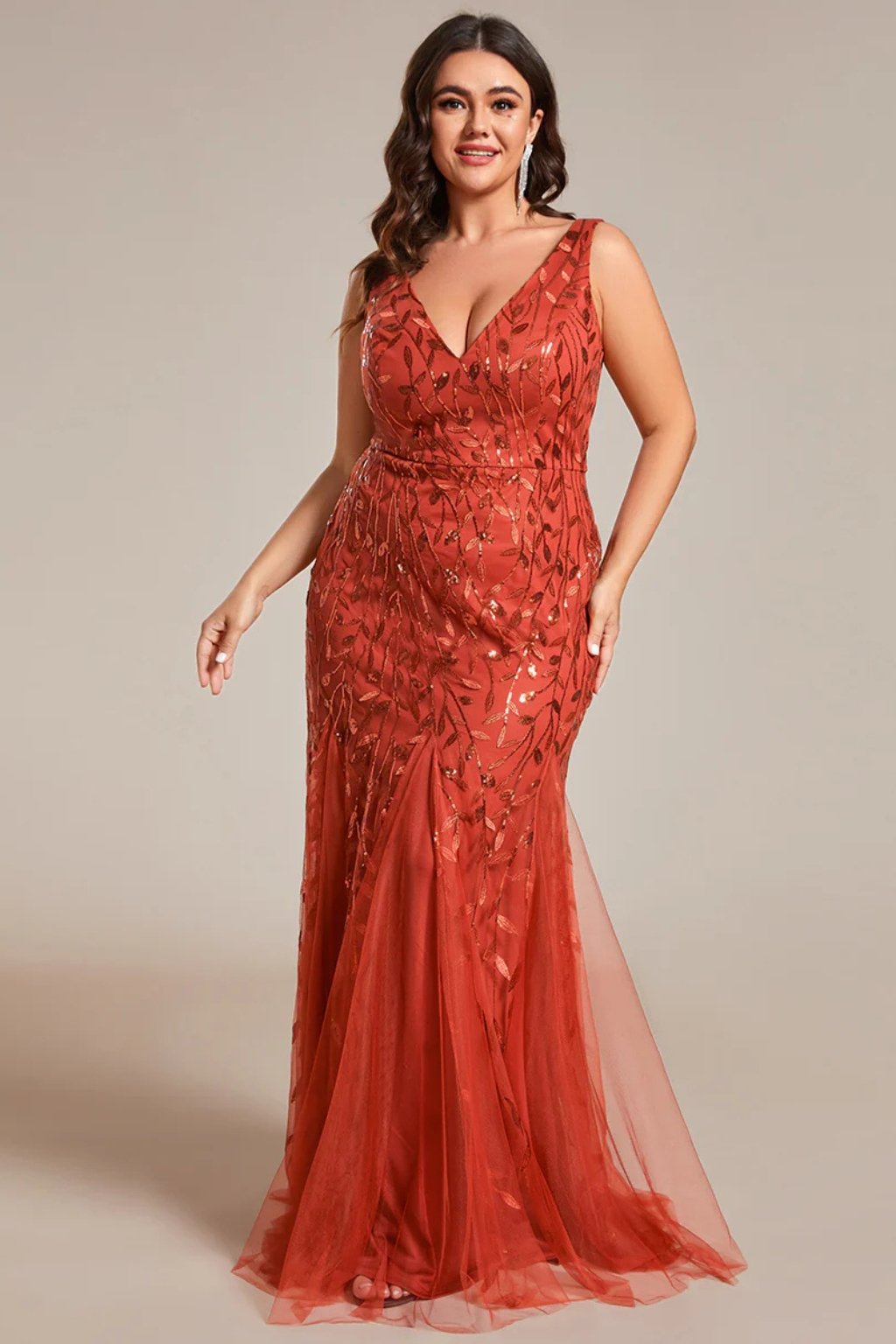 Táto dlhá plus size spoločenská róba v oranžovej farbe z tylu a flitrov je ako stvorená pre ženy, ktoré hľadajú elegantné večerné šaty s výnimočným štýlom. Hlboký výstrih do V krásne predĺži postavu, zatiaľ čo strih do tvaru morskej panny (fishtail) jemne obopne krivky. Trblietavý listový vzor na tylovom povrchu dodáva modelu romantický nádych a zvýrazňuje vašu ženskosť. Šaty sú podšité, nie sú na hrudníku vystužené, zapínajú sa skrytým zipsom na chrbte a sú mierne elastické. Perfektná voľba na ples, svadbu, stužkovú, promócie, večierok, kokteil či inú formálnu udalosť, kde chcete vyniknúť s vkusom a noblesou.