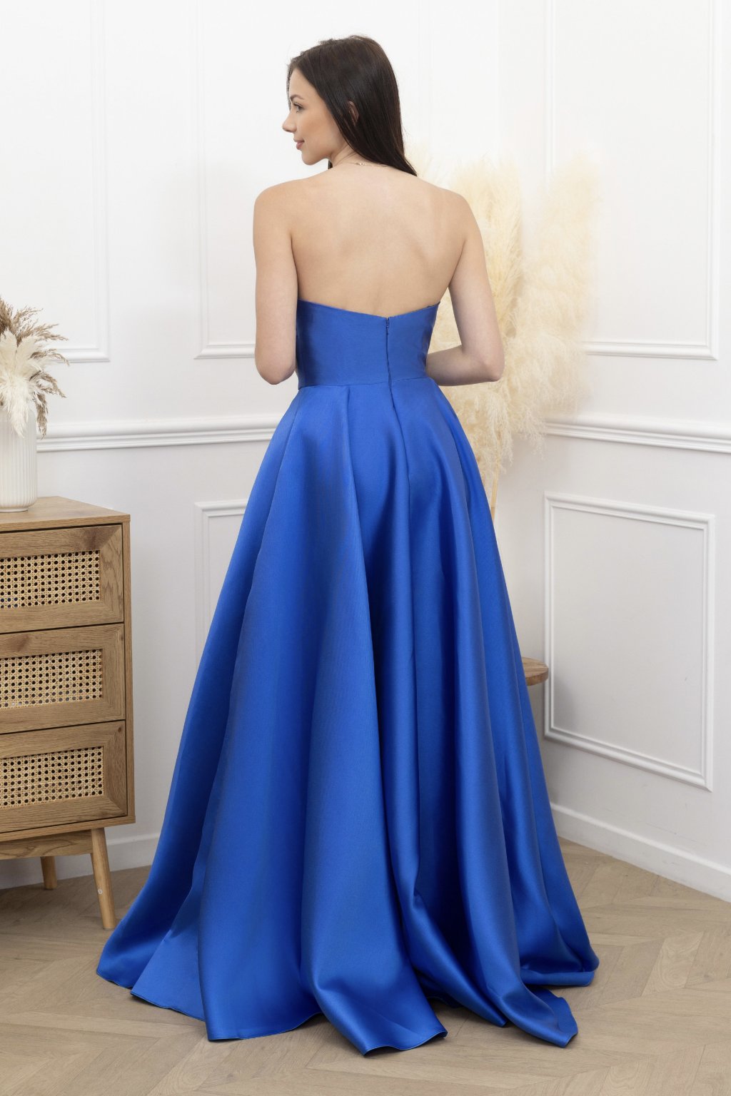Táto dlhá tmavomodrá spoločenská róba je stelesnením jemnej elegancie a ženskosti. Hladký saténový materiál, nariasený vrch, výrazný rozparok na sukni a praktické vrecká z nej robia kombináciu štýlu a komfortu. Súčasťou sú aj pripínateľné ramienka, ktoré zabezpečia väčšiu istotu a flexibilitu pri nosení – ideálna voľba na ples, stužkovú, ako popolnočné šaty či na svadbu ako hosť.