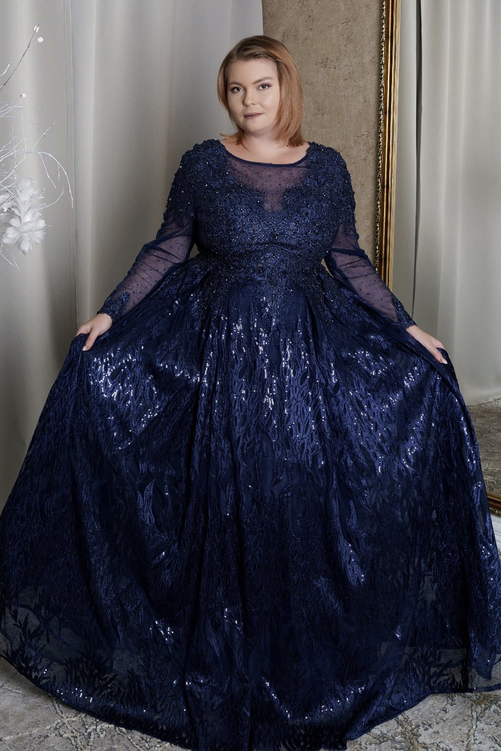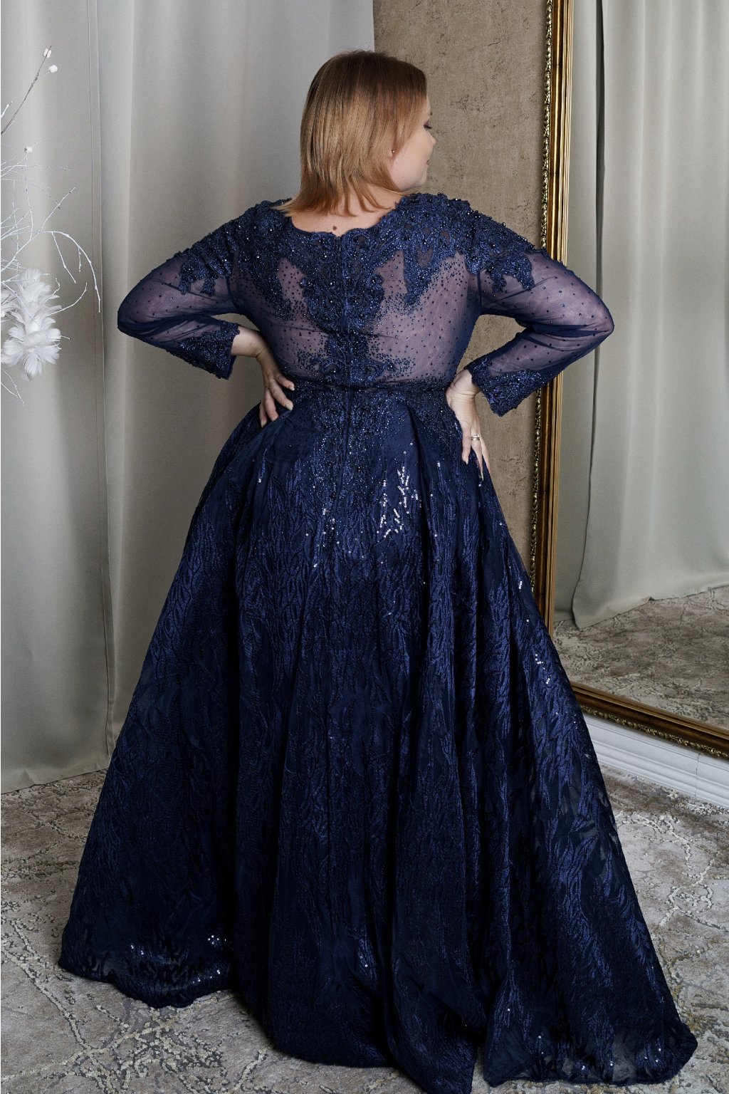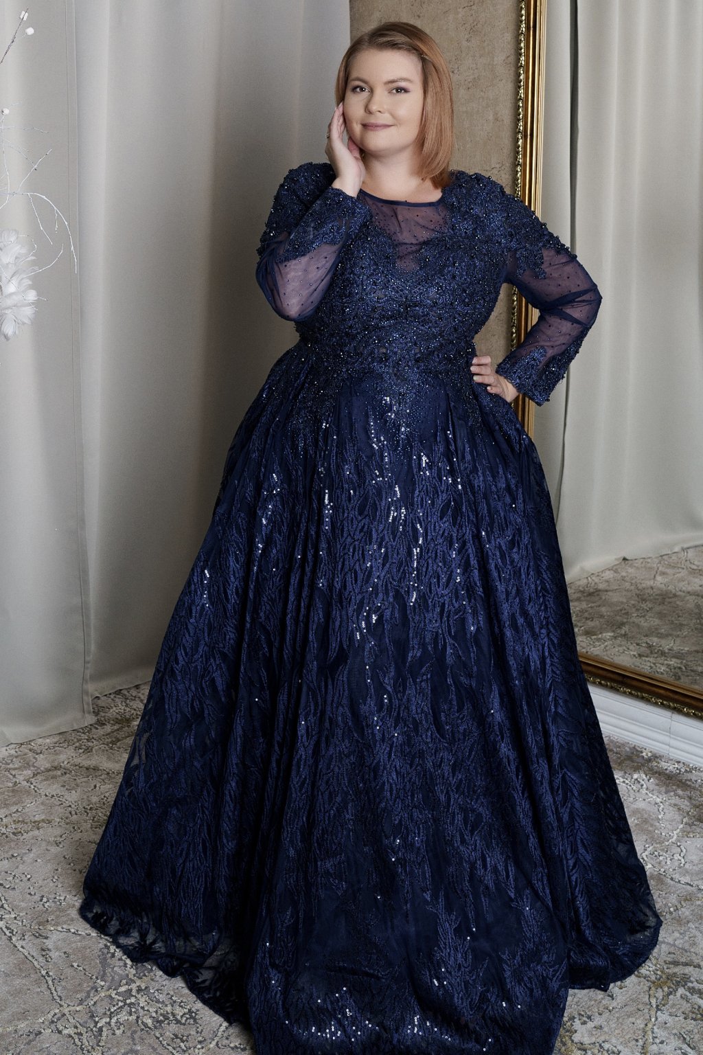 Tieto elegantné dlhé šaty v kráľovskej modrej farbe sú perfektnou voľbou na plesy, svadby či večerné oslavy. Šaty majú dlhé čipkované rukávy a zaujímavý výstrih s priehľadnými detailmi, ktoré dodávajú jemnú ženskosť. Bohato zdobený vrch s trblietavými aplikáciami a nadýchaná sukňa vytvárajú kráľovský vzhľad, ideálny pre každú ženu, ktorá chce zažiariť.