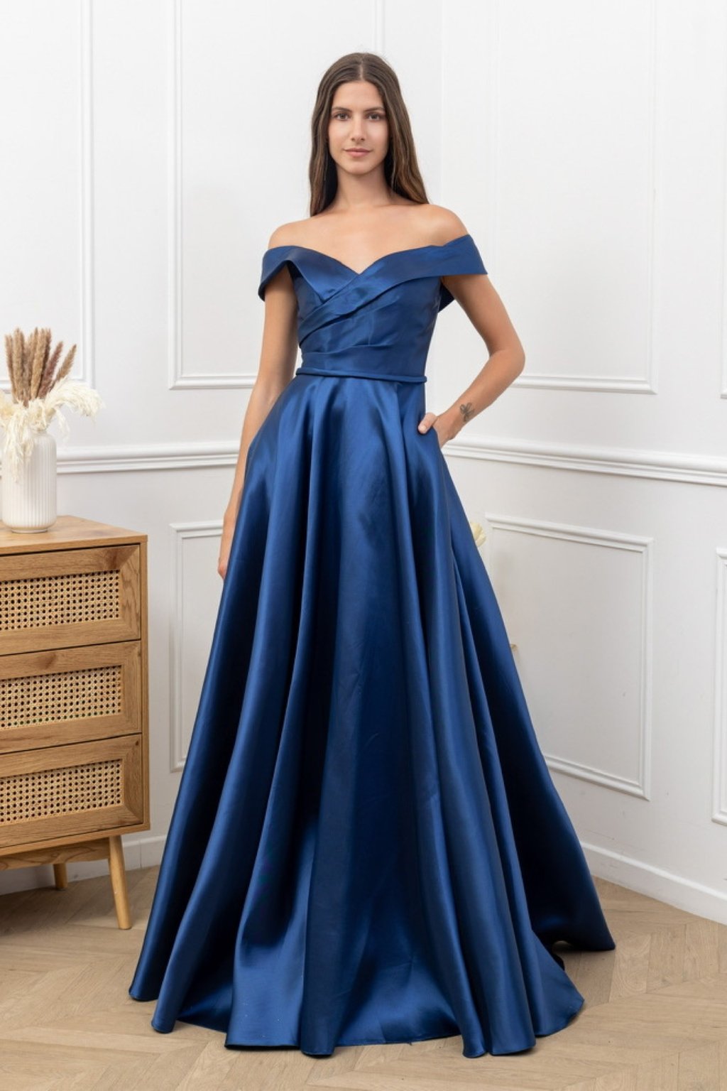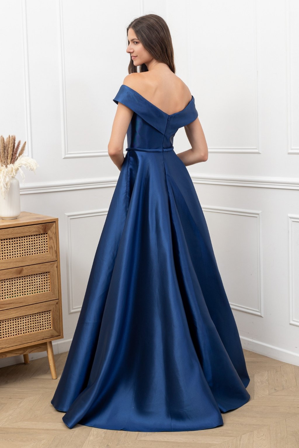 Tmavomodré plus size šaty s dlhou áčkovou sukňou a ramienkami spustenými z pliec sú ideálnou voľbou pre elegantné a sebavedomé ženy. Hladký saténový materiál krásne splýva a lichotí postave, zatiaľ čo prekrižovaný vrch jemne formuje dekolt. Perfektné na ples, svadbu, stužkovú alebo ako popolnočné pre nevestu.