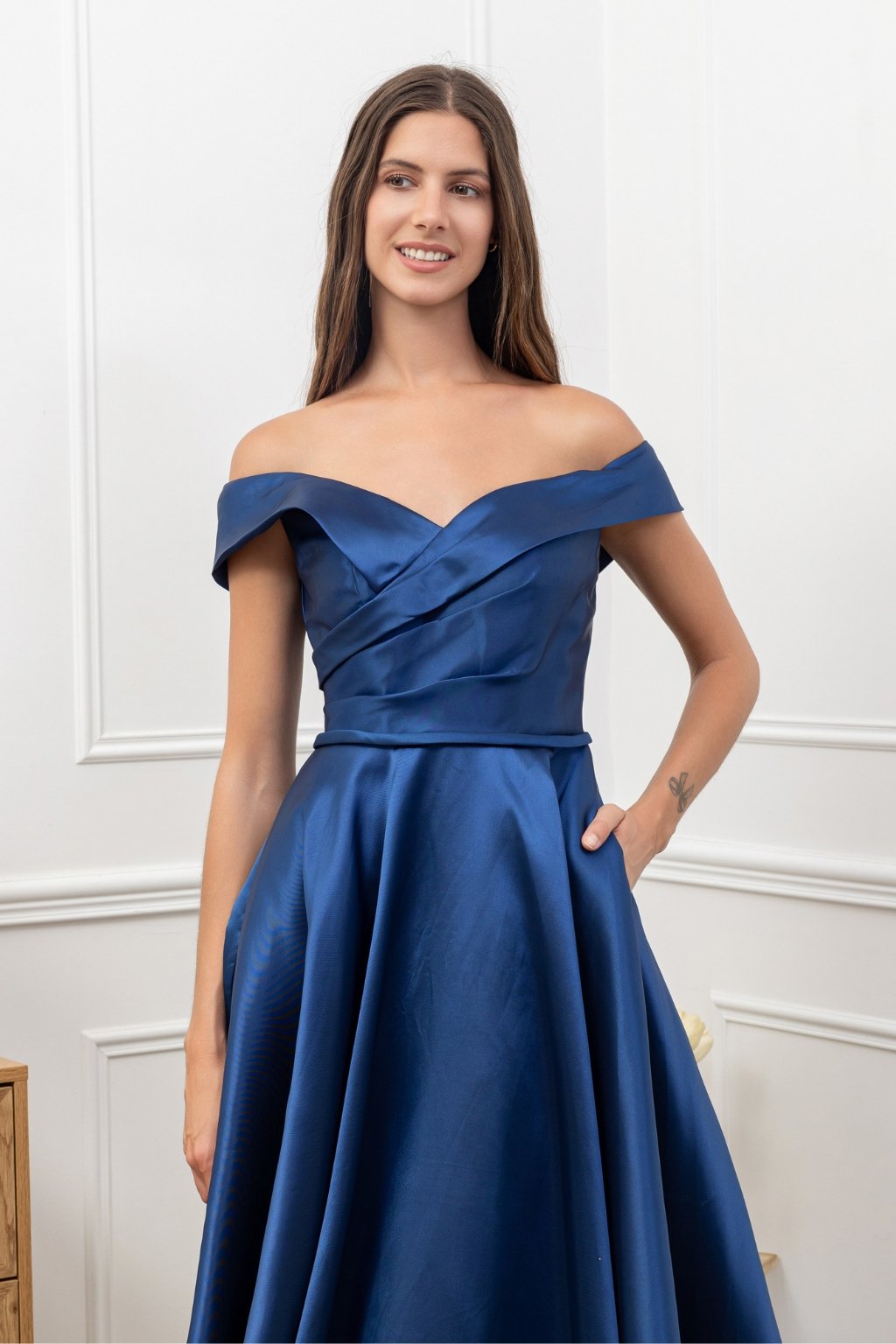 Tmavomodré spoločenské šaty pre moletky s odhalenými ramenami