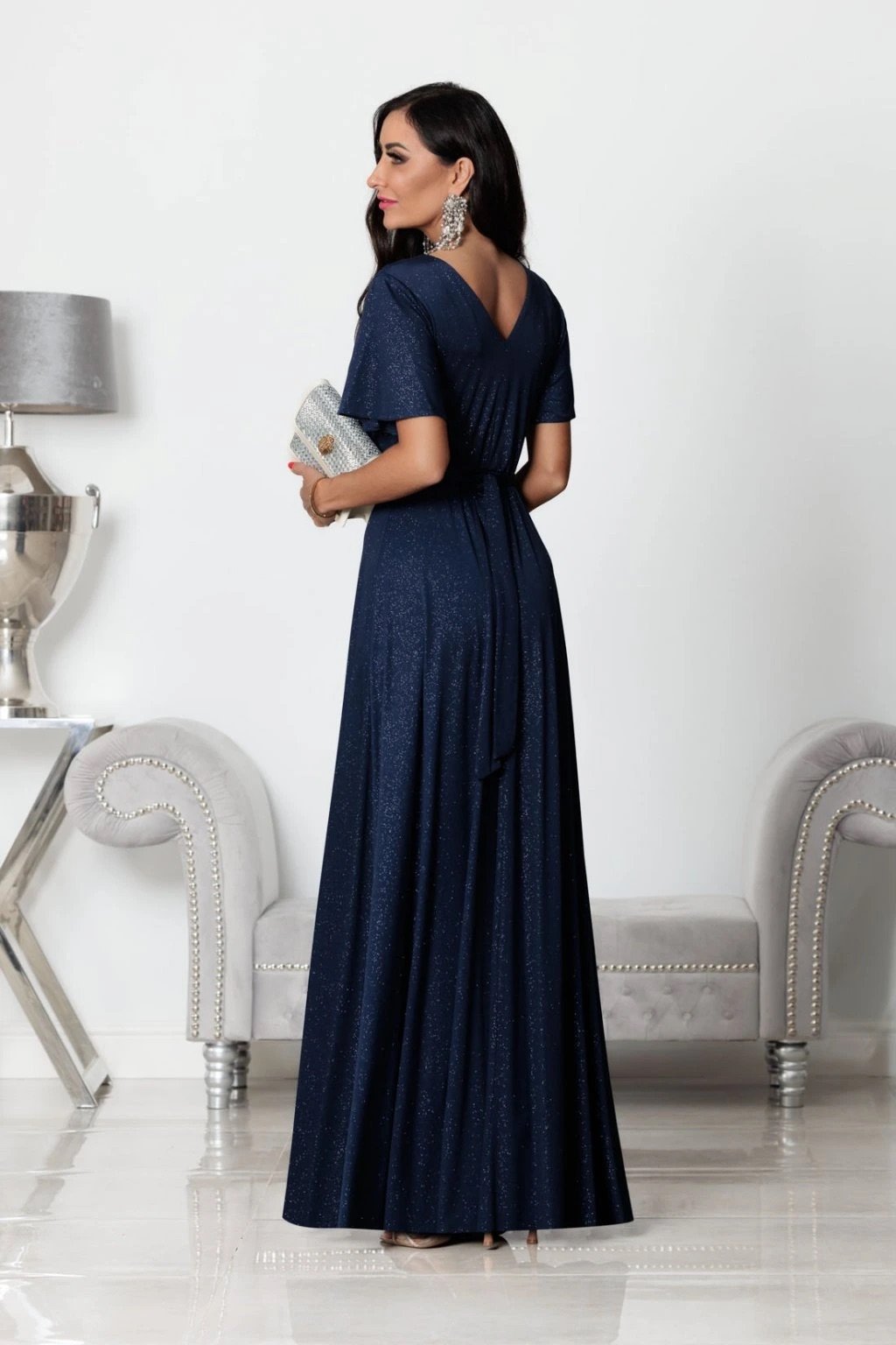 Elegantné dlhé tmavomodré spoločenské šaty z trblietavej látky pôsobia luxusne. Výstrih do V, motýlie rukávy a dizajn s opaskom a gumičkou v páse krásne tvarujú postavu a dodávajú pohodlie, zatiaľ čo rozparok zvýrazní ženskosť. Ideálne na stužkovú, ples, svadbu, oslavu či večierok.