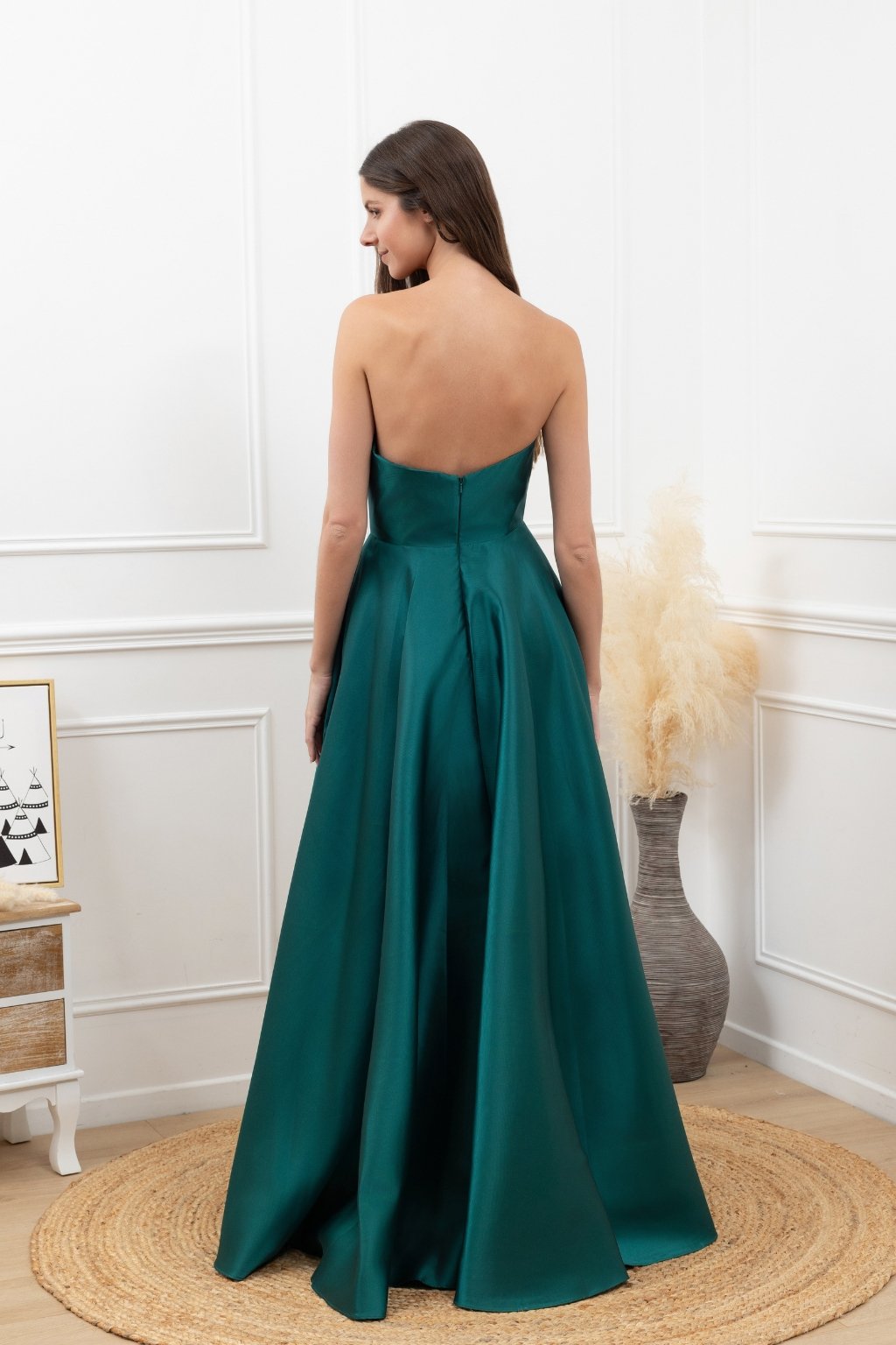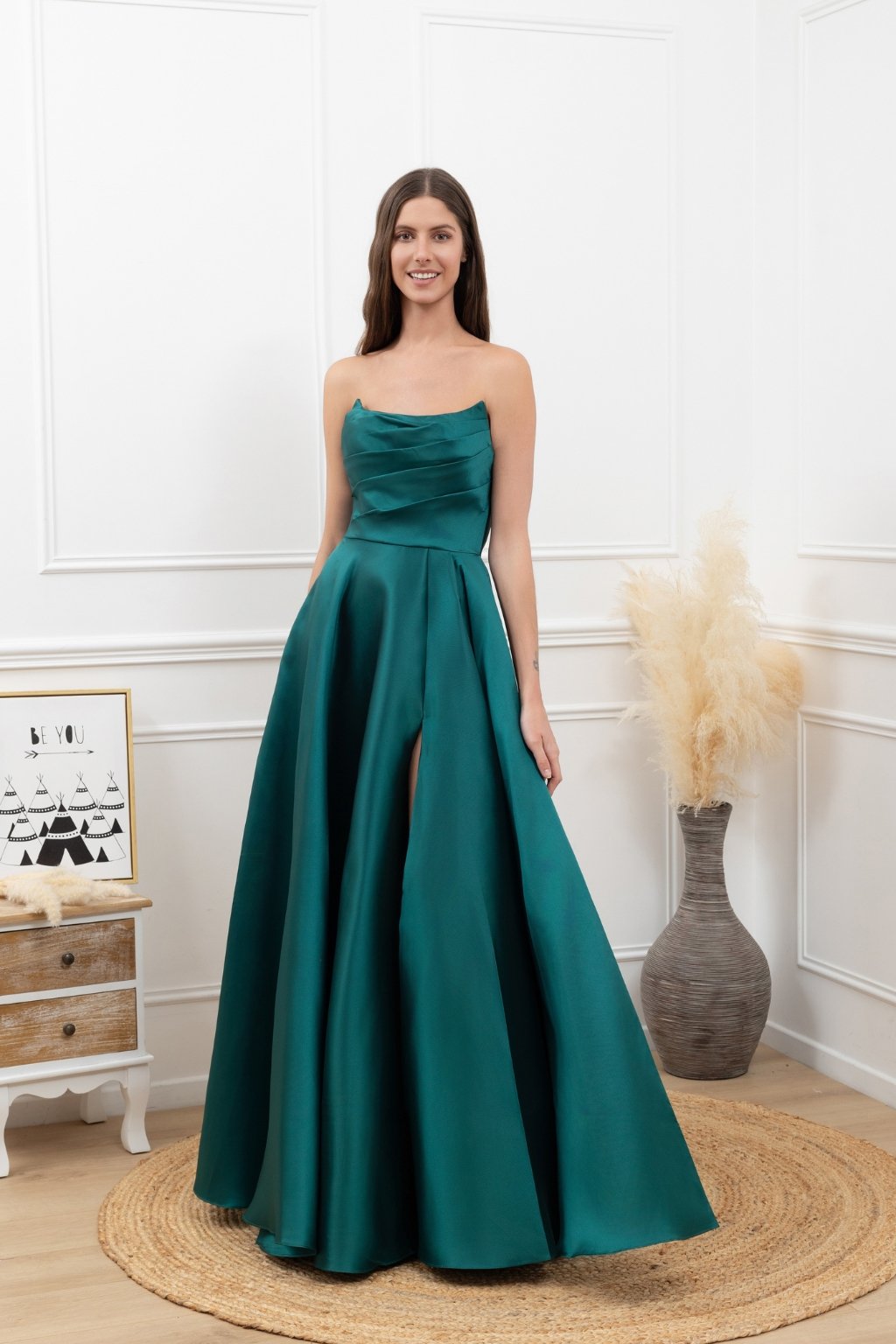 Táto dlhá tmavozelená spoločenská róba je stelesnením jemnej elegancie a ženskosti. Hladký saténový materiál, nariasený vrch, výrazný rozparok na sukni a praktické vrecká z nej robia kombináciu štýlu a komfortu. Súčasťou sú aj pripínateľné ramienka, ktoré zabezpečia väčšiu istotu a flexibilitu pri nosení – ideálna voľba na ples, stužkovú, ako popolnočné šaty či na svadbu ako hosť.
