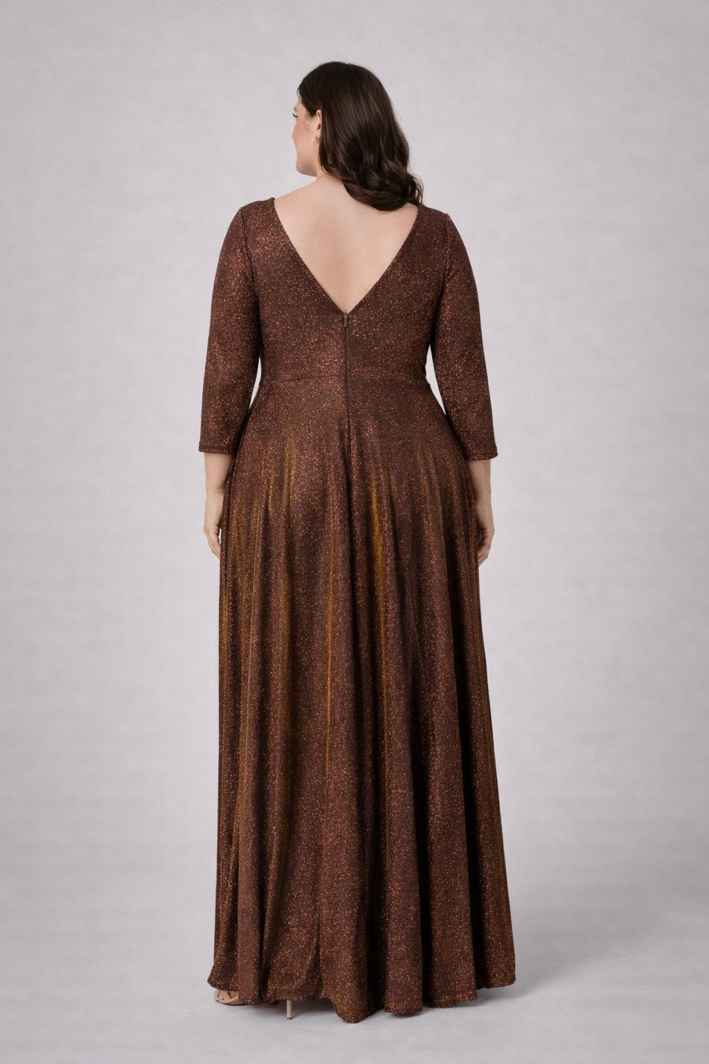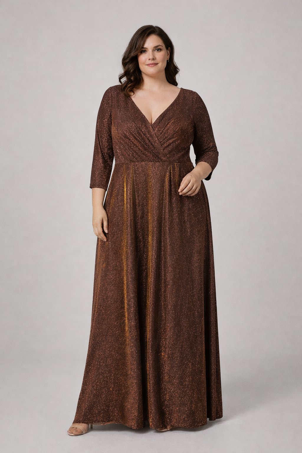 Tieto dlhé spoločenské šaty plus size v luxusnej bronzovo-hnedej farbe s jemným trblietavým efektom sú dokonalou voľbou pre ženy, ktoré chcú pôsobiť elegantne a výnimočne. Majú prekladaný V-výstrih, ktorý zvýrazní dekolt, pričom výstuž na hrudníku zabezpečuje spoľahlivú oporu a pohodlie počas celej udalosti. Elastický materiál s jemným leskom sa krásne prispôsobí postave a zvýrazní ženské krivky. Šaty majú 3/4 rukávy, ktoré elegantne zakryjú paže, a áčkovú maxi sukňu až po zem, ktorá opticky predlžuje siluetu. Zadná časť je doplnená o V-výstrih na chrbte, čo dodáva modelu sofistikovaný nádych.