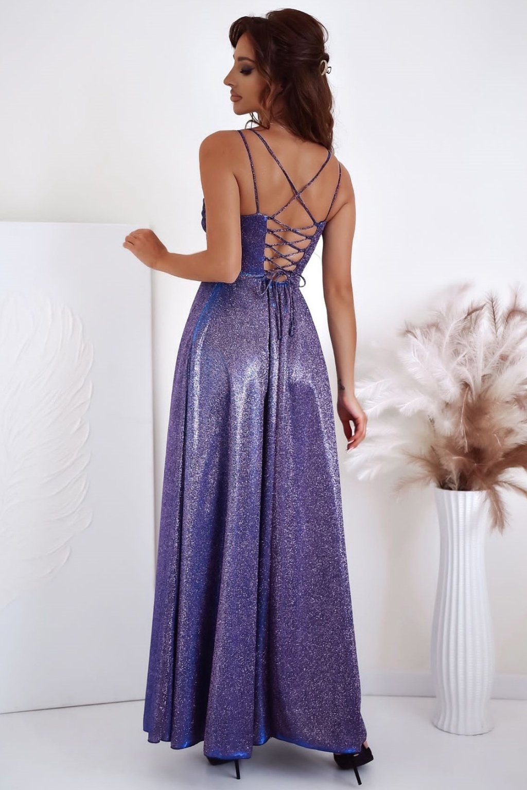 Elegantné dlhé spoločenské šaty v trblietavej fialovej s rafinovaným splývavým vrchom a jemnými špagetovými ramienkami očaria na každom plese, svadbe či stužkovej. Zvýraznený rozparok na sukni, zvodné viazanie na chrbte a praktická gumička v páse zabezpečia dokonalé prispôsobenie postave a maximálne pohodlie. Tento luxusný model šiat je ideálny na svadby, večierky, plesy alebo ako šaty pre družičky, keď chcete zažiariť a cítiť sa neodolateľne.