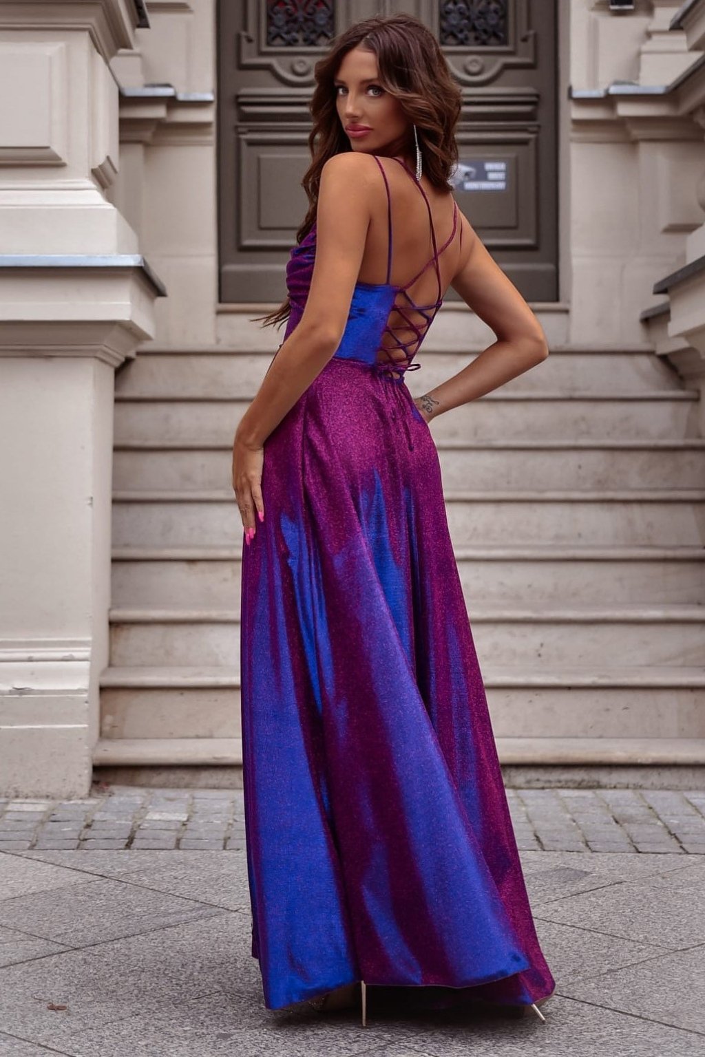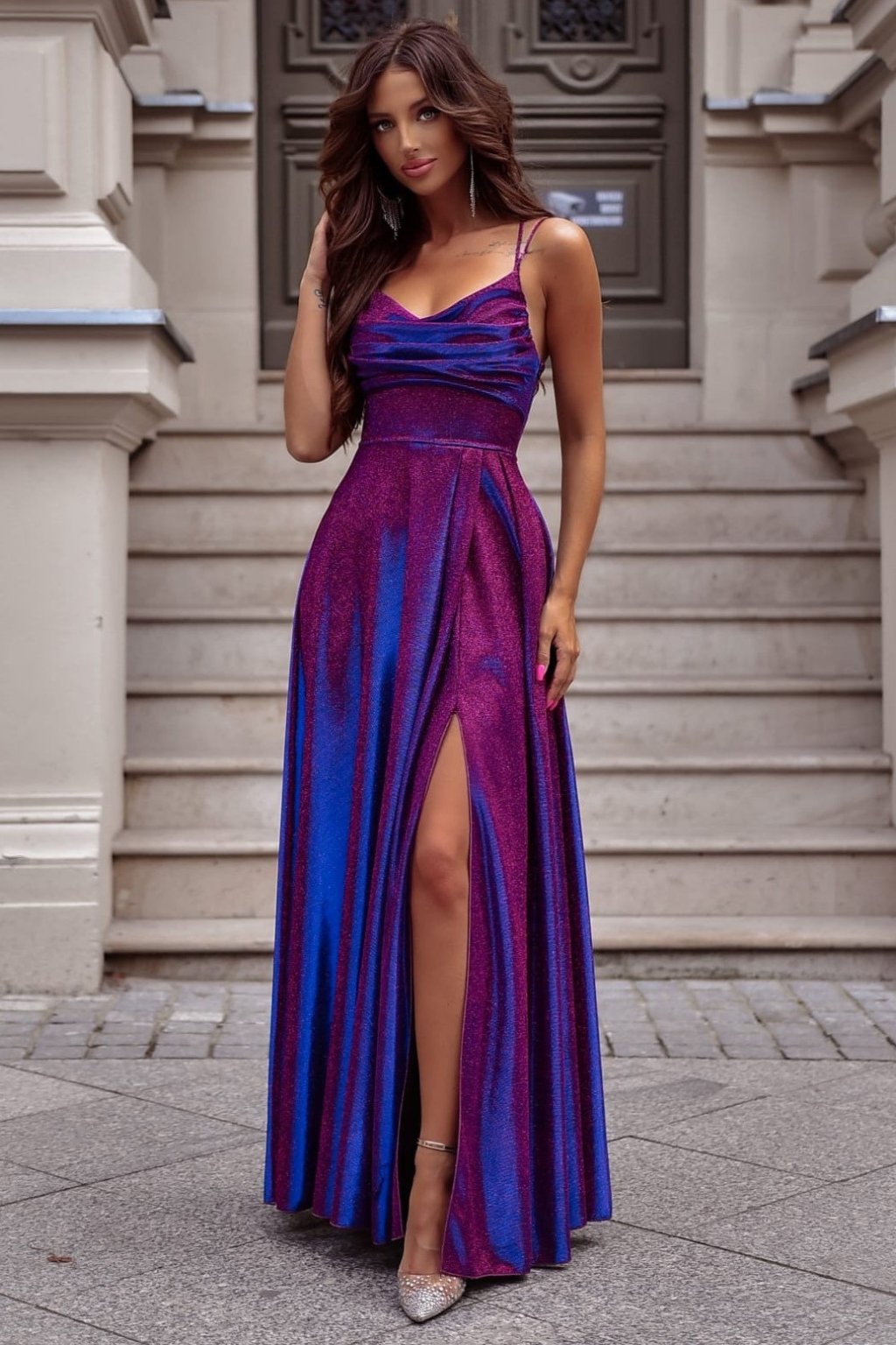 Elegantné dlhé spoločenské šaty v trblietavej fialovomodrej farbe s rafinovaným splývavým vrchom a jemnými špagetovými ramienkami očaria na každom plese, svadbe či stužkovej. Zvýraznený rozparok na sukni, zvodné viazanie na chrbte a praktická gumička v páse zabezpečia dokonalé prispôsobenie postave a maximálne pohodlie. Tento luxusný model šiat je ideálny na svadby, večierky, plesy alebo ako šaty pre družičky, keď chcete zažiariť a cítiť sa neodolateľne.