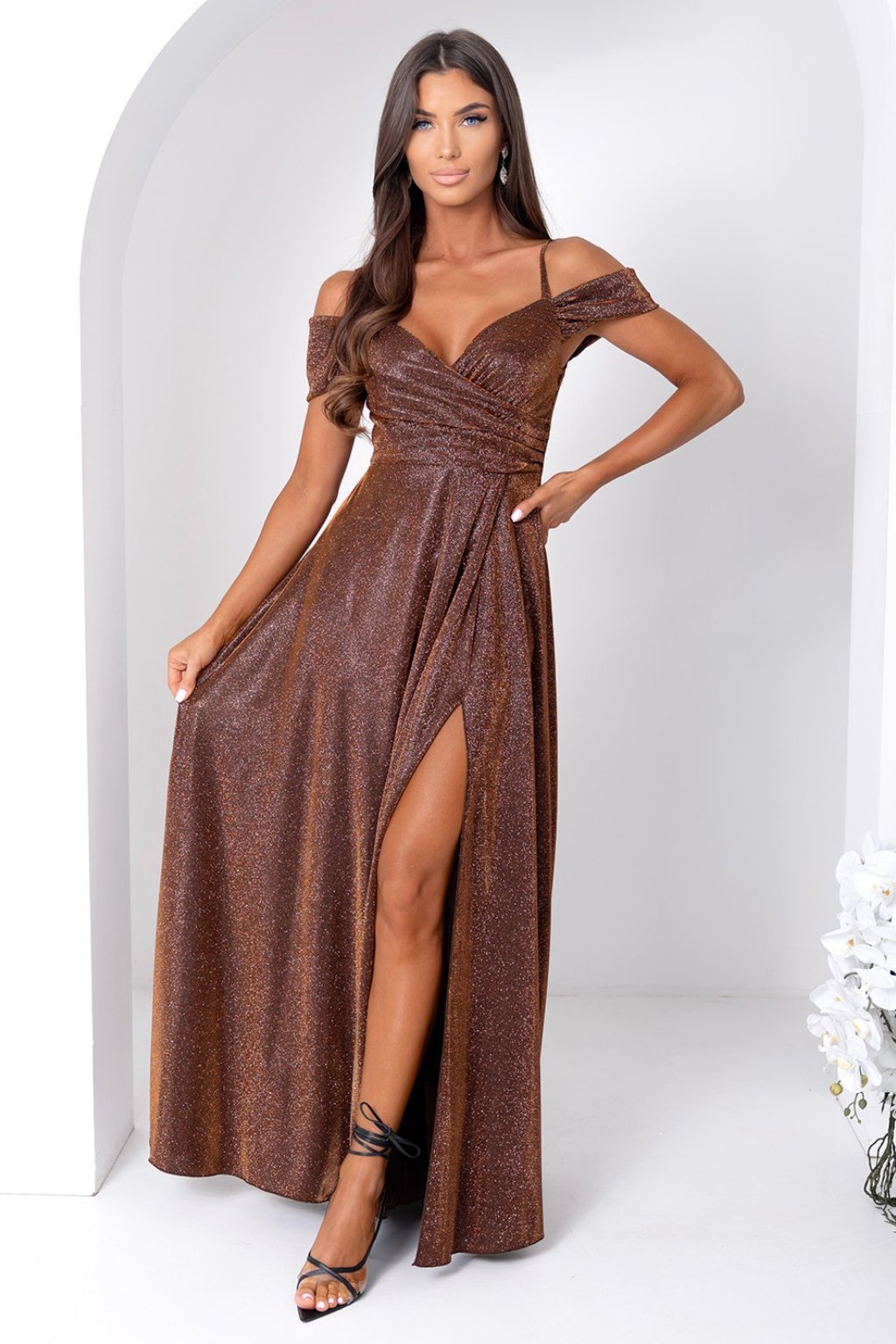 Trblietavé hnedé dlhé spoločenské šaty s rozparkom