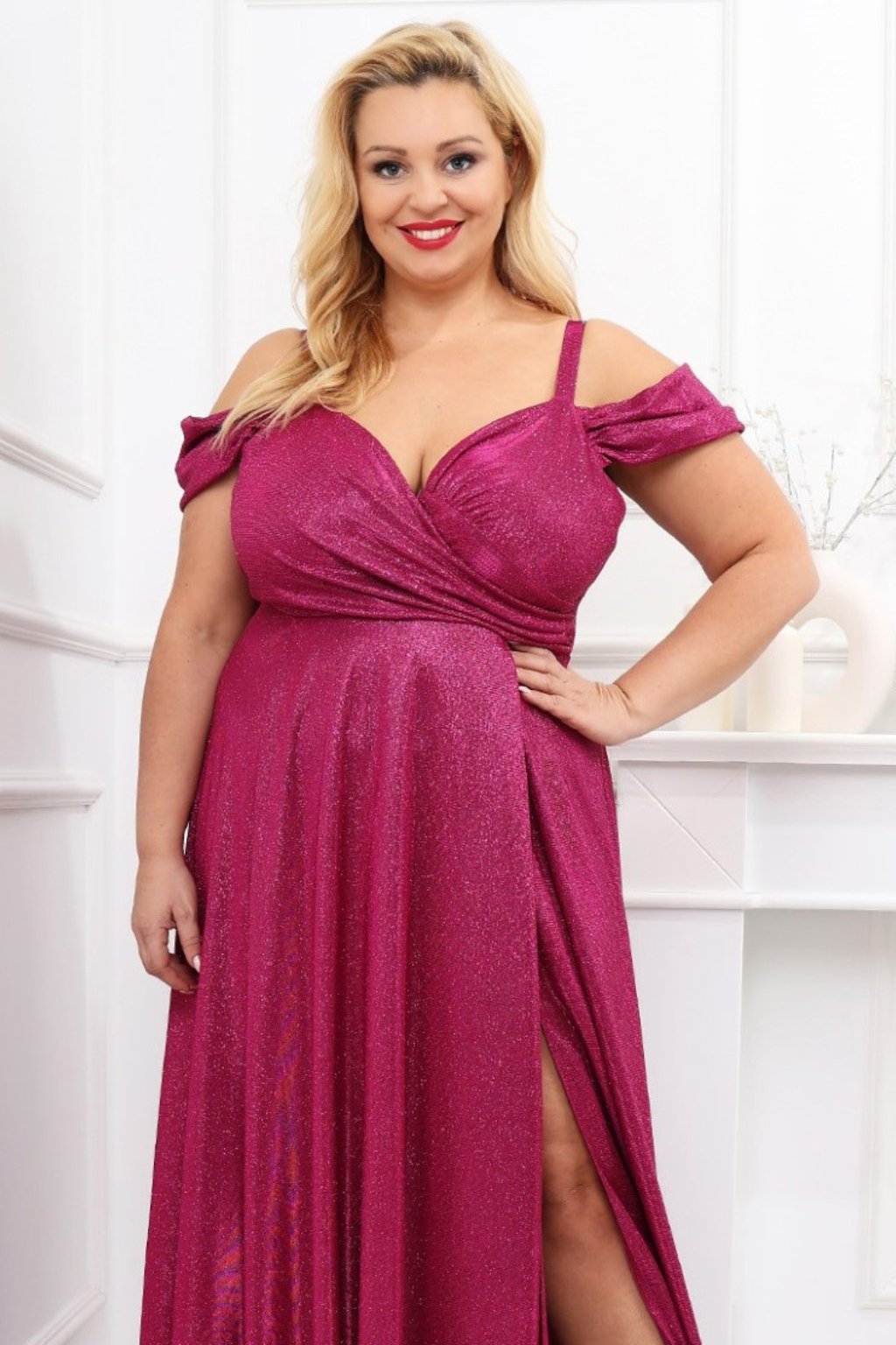 Elegantné dlhé spoločenské šaty v žiarivej malinovej farbe s jemným trblietavým leskom, ktoré podčiarkujú ženskú postavu a pôsobia luxusne. Vrch s výstrihom do V a spustenými rukávmi v kombinácii s tenkými ramienkami dodáva šatám romantický nádych, zatiaľ čo rozparok na nohe prináša zvodný detail. Ideálne na ples, stužkovú, svadbu, večierok alebo slávnostnú príležitosť, kde chcete zažiariť a cítiť sa výnimočne.