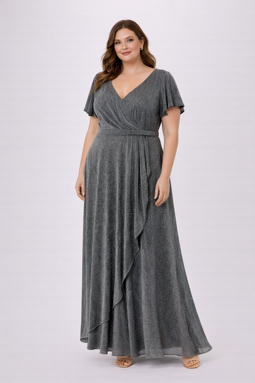 Tieto dlhé sivé spoločenské šaty plus size s trblietavým efektom sú dokonalou voľbou pre ženy, ktoré hľadajú eleganciu, pohodlie a nadčasový štýl. Šaty majú hlboký V-výstrih, ktorý krásne zvýrazní dekolt, pričom výstuž na hrudníku zabezpečuje spoľahlivú oporu a komfort počas celej udalosti. Model je vyrobený z elastického, príjemného materiálu, ktorý sa prispôsobí postave a lichotí ženským krivkám. Krátke padavé rukávy v motýľovom štýle elegantne zakryjú paže a dodajú šatám vzdušnosť. Dominantným prvkom je jemne riasený pás a prekladaný vrch, ktorý opticky zoštíhľuje postavu. Áčková maxi sukňa až po zem s decentným volánovým detailom pôsobí slávnostne a žensky. Zadná časť je doplnená o V-výstrih na chrbte pre ešte sofistikovanejší vzhľad.