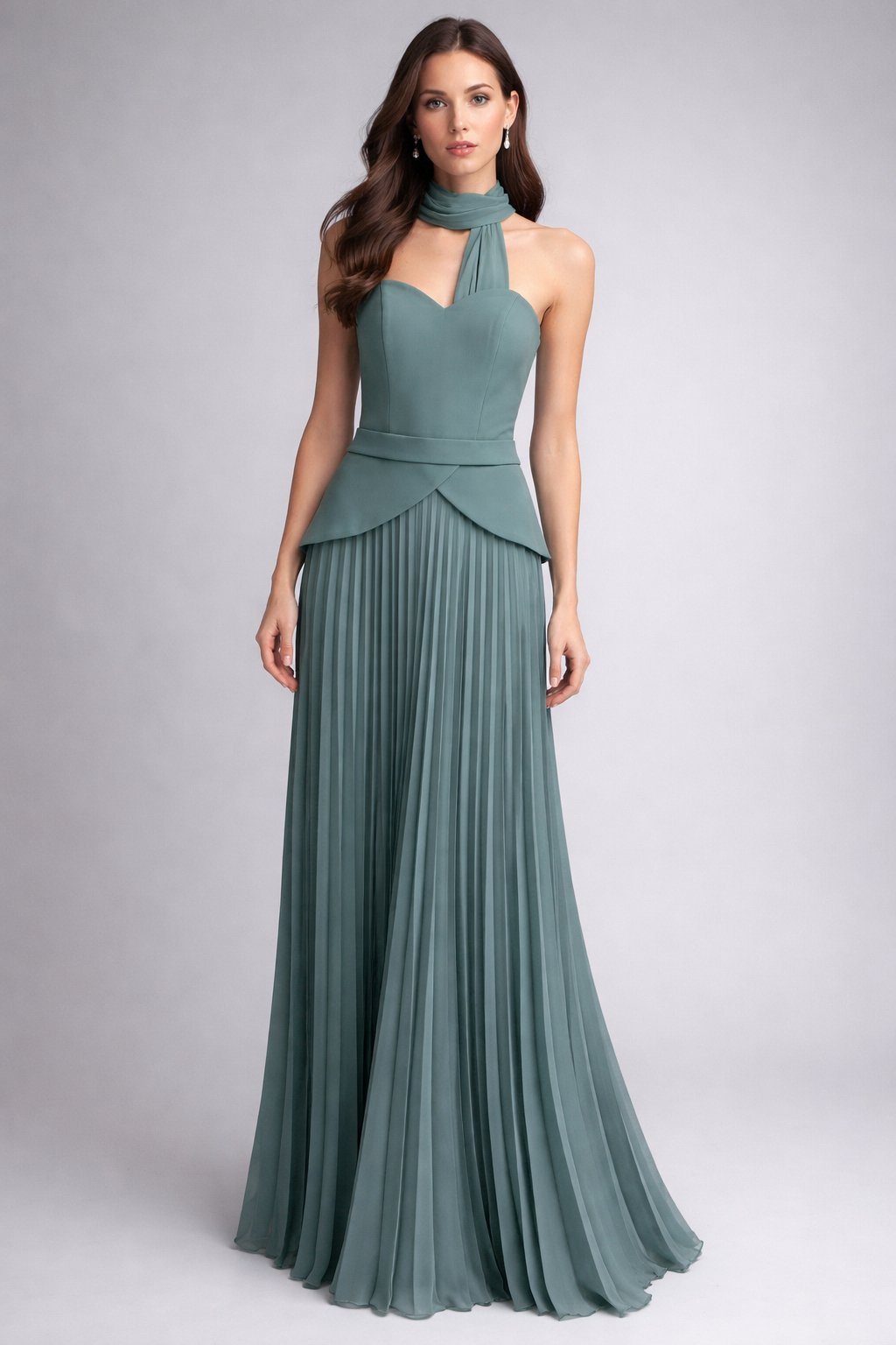 Luxusné zelené spoločenské šaty dlhé sú dokonalou voľbou pre ženy, ktoré chcú zažiariť na výnimočných udalostiach. Šaty majú korzetový vrch bez rukávov s tvarovaným srdcovým výstrihom, ktorý krásne zvýrazní dekolt. Súčasťou modelu je elegantný šál okolo krku, ktorý dodáva šatám originálny a sofistikovaný vzhľad. V páse sa nachádza prekladaný detail, ktorý opticky zoštíhľuje siluetu. Dominantou je dlhá plisovaná sukňa, ktorá pôsobí vzdušne a luxusne pri každom pohybe. Ideálne na ples, svadbu, stužkovú, galavečer či spoločenské udalosti.