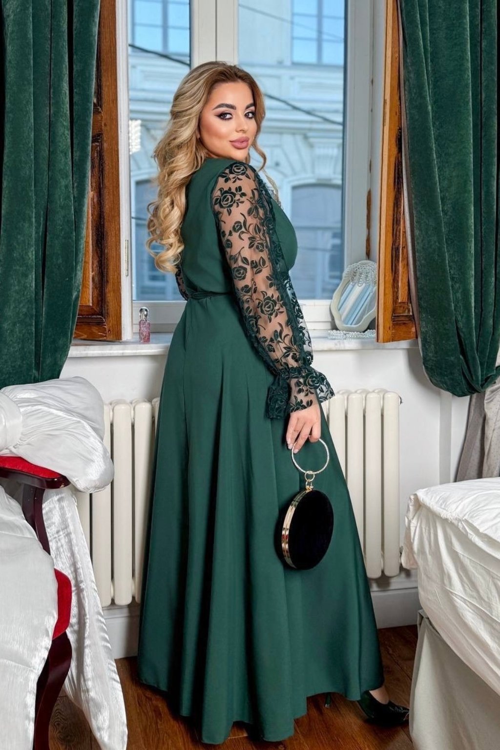 Tieto dlhé zelené spoločenské šaty na zavinovanie sú dokonalou voľbou pre ples, svadbu, stužkovú alebo večerný večierok. Vrch s hlbokým výstrihom krásne zvýrazní dekolt, zatiaľ čo transparentné sieťované rukávy s velúrovým kvetinovým vzorom dodávajú šatám luxusný a ženský vzhľad. Ľahký šifónový materiál s jemným leskom, praktické zavinovanie a gumičky na rukávoch zabezpečujú komfort a prispôsobenie každej postave.