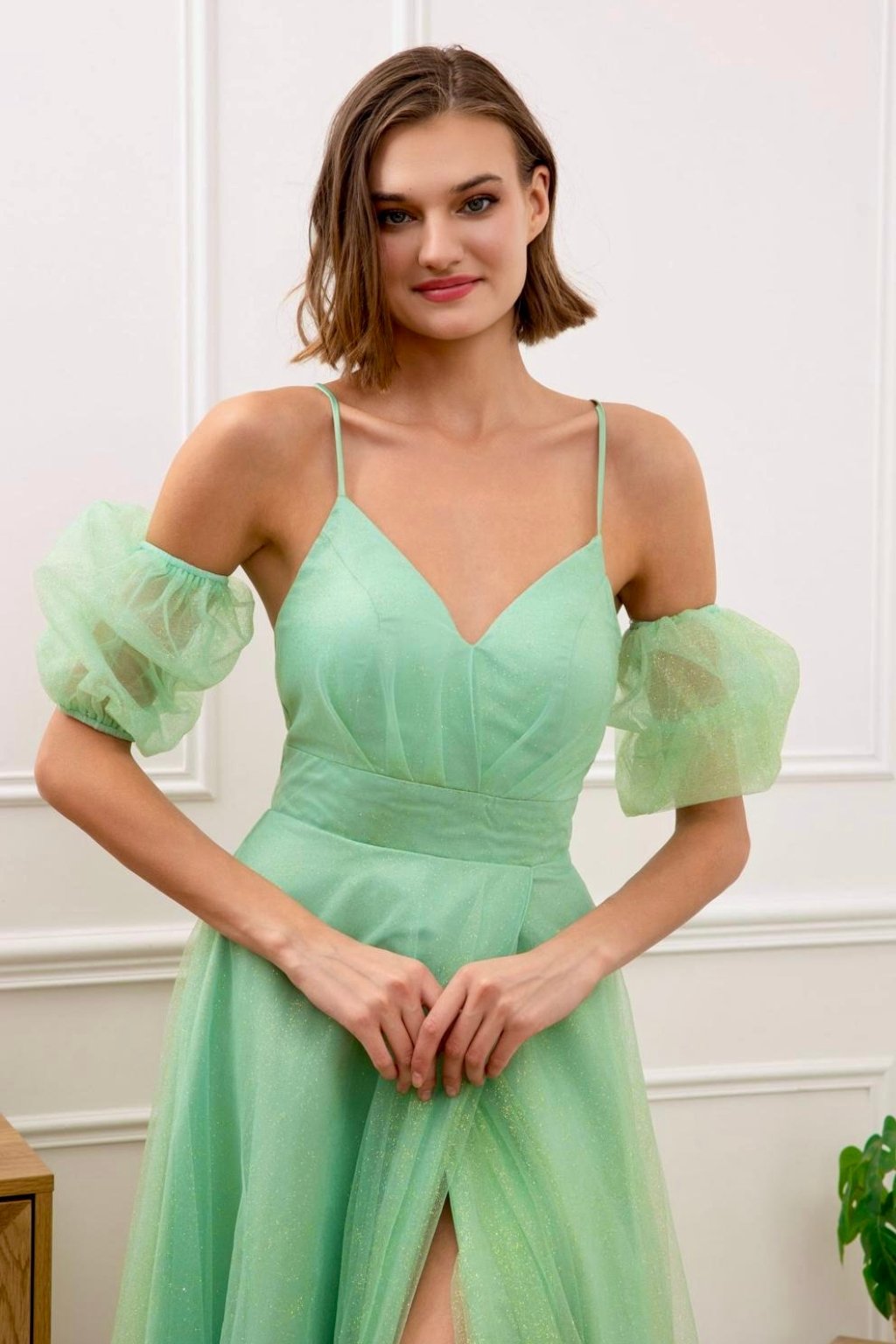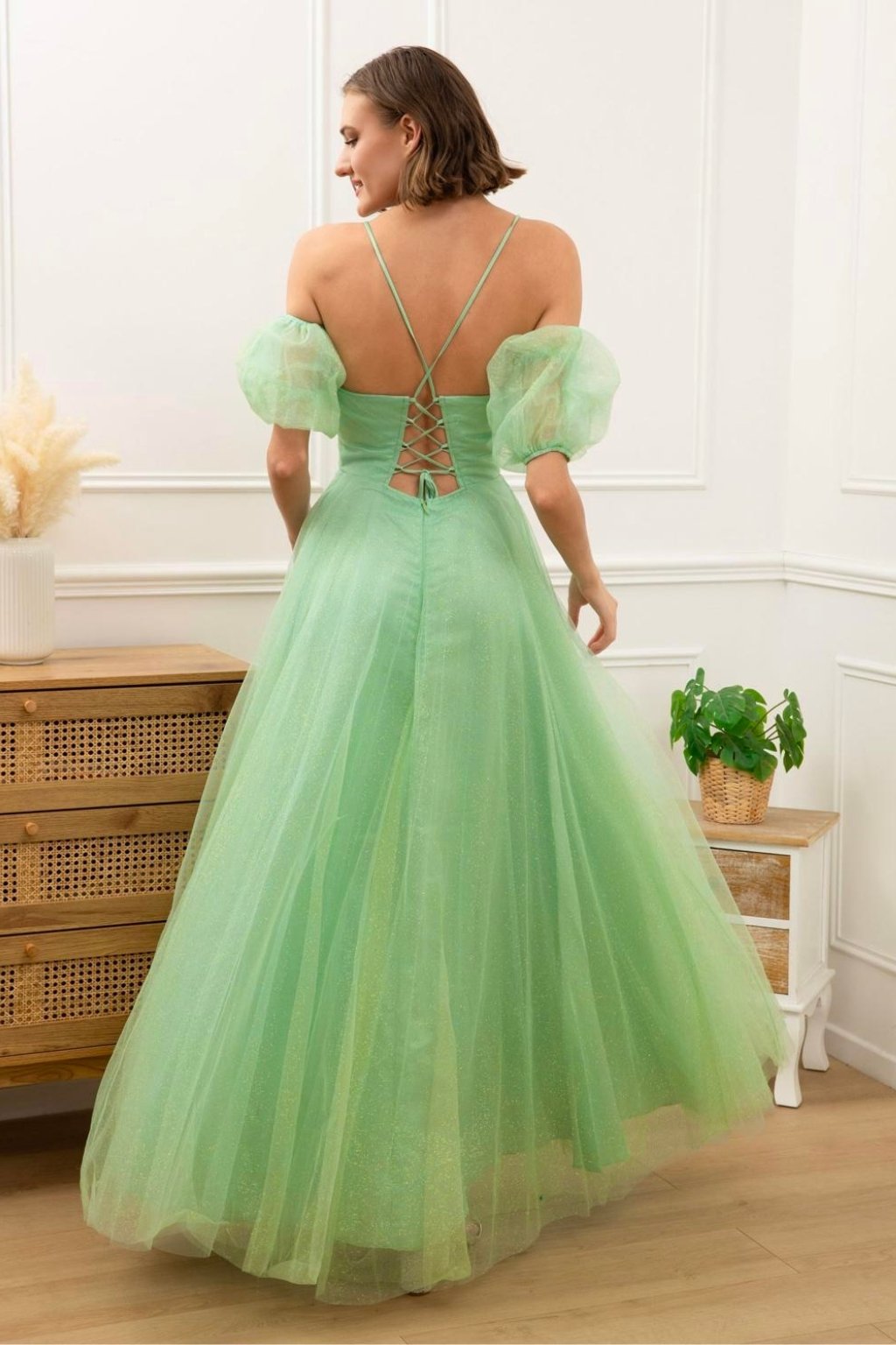 Dlhé zelené tylové spoločenské šaty s A-línovou sukňou a vysokým rázporkom okamžite pritiahnu pozornosť, pričom jemná trblietavá vrstva dodá vášmu každému kroku éterický lesk. Vrch s hlbokým V výstrihom na tenkých ramienkach a odnímateľnými balónovými rukávmi zmyselne odhaľuje ramená, kým korzetové šnurovanie vzadu krásne formuje pás a umožňuje dokonalé prispôsobenie postave. Ak hľadáte dlhé zelené šaty, tylové šaty s rázporkom, šaty s odhalenými ramenami či šaty na ples, svadbu alebo stužkovú, tento model je skvelou voľbou.
