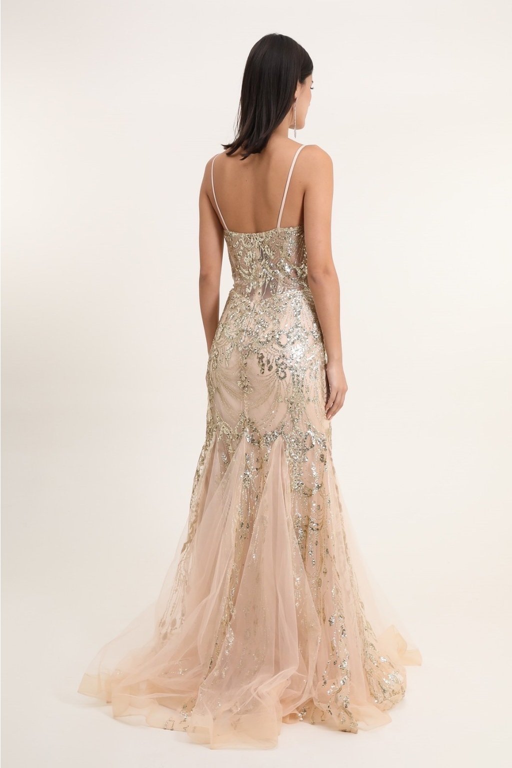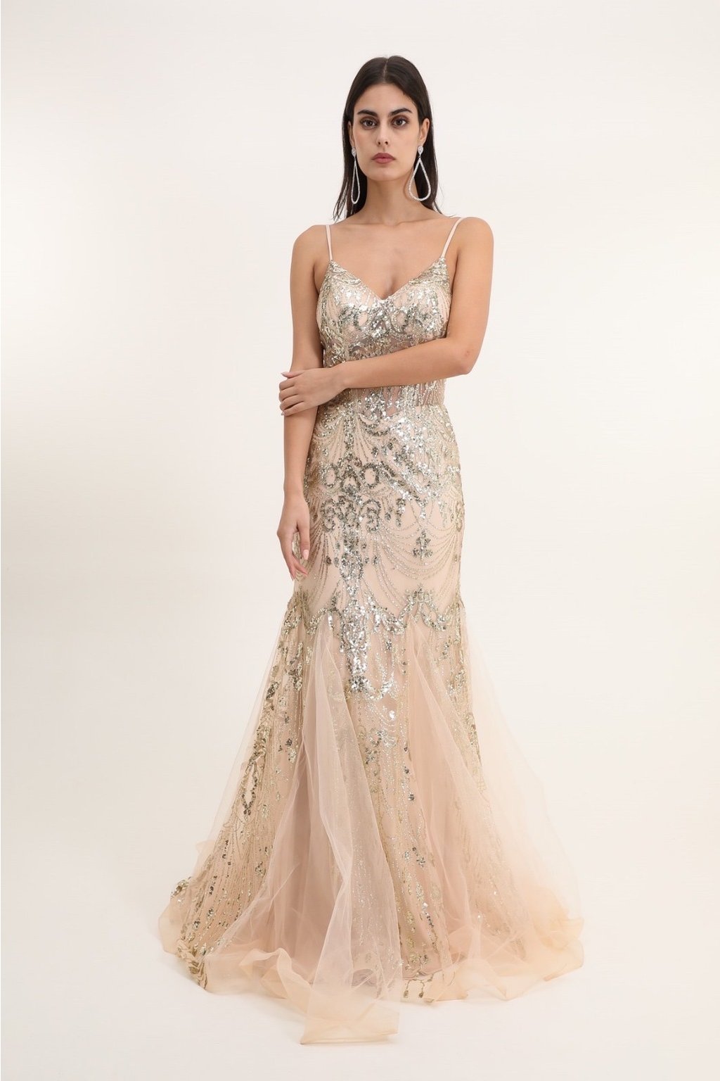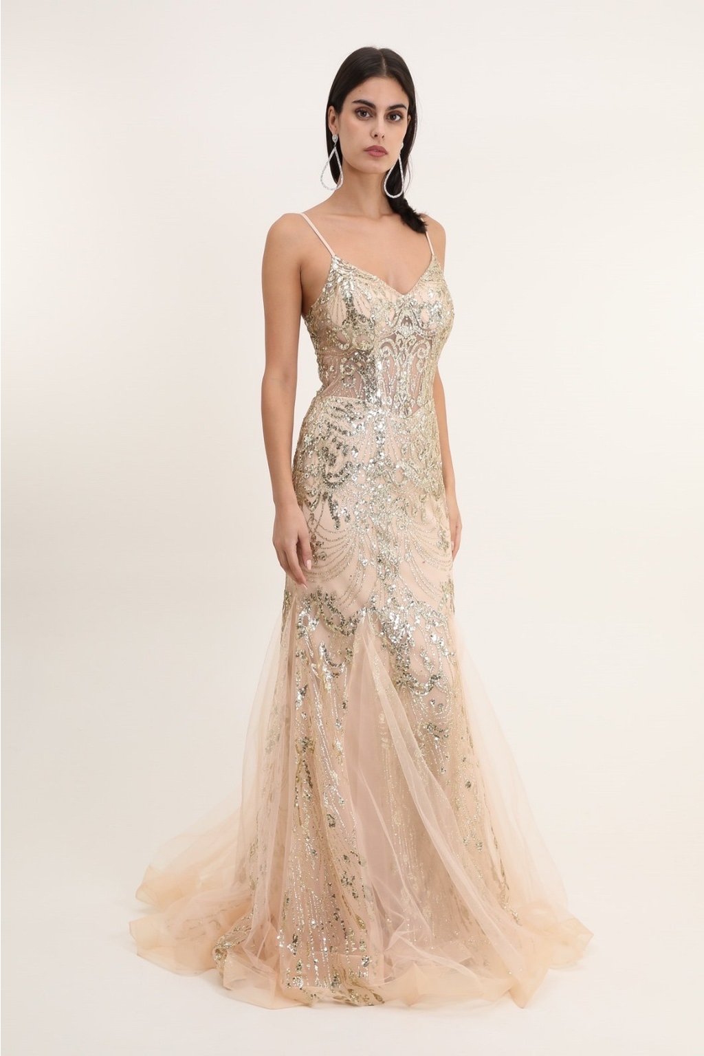 Tieto zlaté trblietavé šaty v štýle morskej panny sú dokonalou voľbou na ples, gala večer, svadbu či iné výnimočné udalosti. Úzky priliehavý strih so špagetovými ramienkami nádherne zvýrazňuje postavu a dodáva šatám luxusný vzhľad. Bohaté zdobenie s flitrami a jemná tylová sukňa vytvárajú očarujúci efekt, vďaka ktorému budete neprehliadnuteľná.